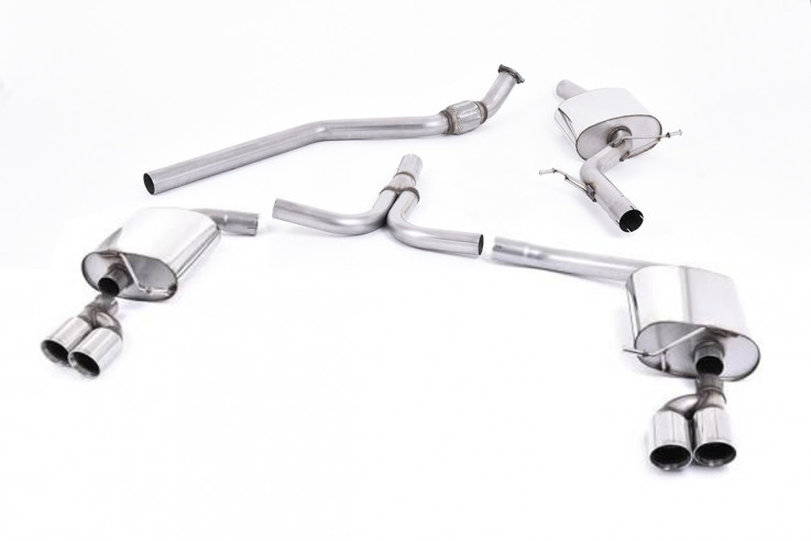 Milltek Sport nabízí několik variant catback výfuků pro AUDI A4 (B8) S-line 2WD + quattro TFSI (pouze s manuální převodovkou). Základní rozdělení je dle počtu tlumičů, kde verze bez rezonátoru nemá středový tlumič, který je nahrazen trubkou. Tato verze je nejhlasitější, což nemusí každému vyhovovat.