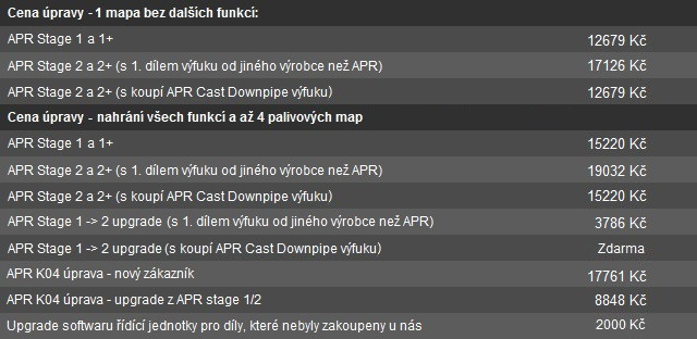 Úprava je nabízena pro různé specifikace paliva, podle oktanového čísla. Zde můžete shlédnout výkonostní tabulky v závislosti na použitém palivu a výchozího motoru, jestli se jedná o 120hp verzi nebo 160hp verzi motoru 1,8 TFSI. Mapy pro různé oktanové specifikace si pak můžete přepínat podle aktuální dostupnosti paliva ve Vašem okolí.