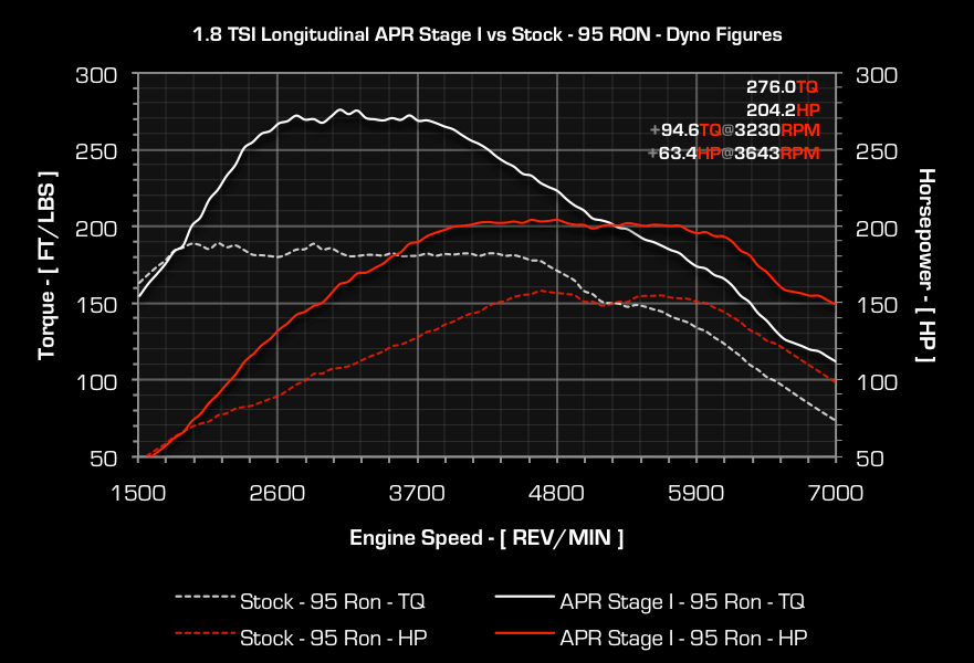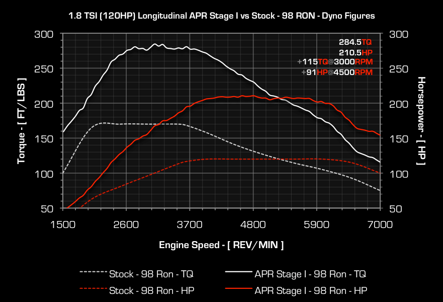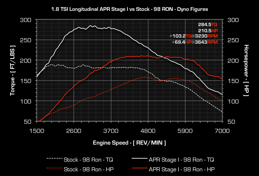 APR Stage 1 úprava Řídící jednotky je jedna z nejlepších úprav v přepočtu ceny na každého přidaného koně pro motor 1,8 TFSI, která mu dopřeje o dost více síly a ostrosti, jakou by měl mít již z výroby, aniž by se motor hnal ke svým limitům. S průběhem výkonu, jako by byl z výroby a vylepšenými jízdními vlastnostmi, vyplní APR Stage I úprava Řídíci jednotky slabší místo v jinak excelentním autě.