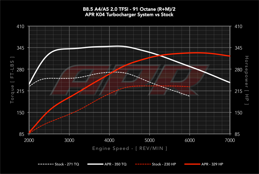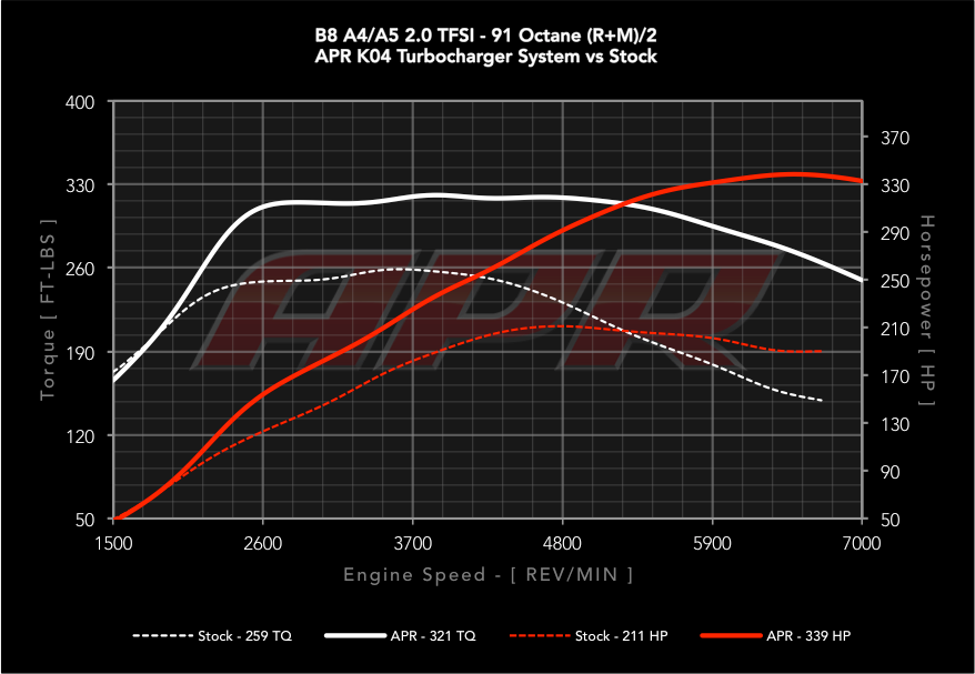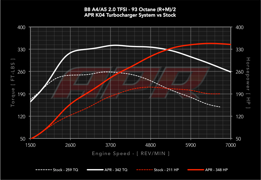 APR Stage 3 Úprava Řídící jednotky je navržena pro motor, který je osazený větším K04 turbodmychadlem, lepším sáním a větším intercoolerem. S těmito díly a úpravou řídící jednotky naměřili APR kalibrační inženýři vyšší maximální výkon B8 / B8.5 - 348/344 koní a točivý moment 465/500Nm za použití 98 oktanového paliva. Velký nárust výkonu a točivého momentu je v celém spektru otáček a dosahuje až +137 koní a 150!! Nm.