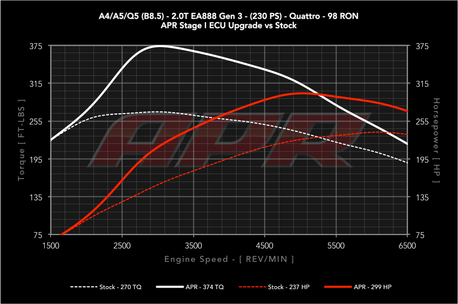 APR Stage 1 úprava řídící jednotky nevyžaduje žádné sportovní díly, je tak určená pro naprosto sériový vůz a produkuje 288-299hp a 492-507Nm v závislosti na oktanové specifikaci použitého paliva, viz grafy níže. Nárust výkonu 61hp a 135Nm je dostupný ve středních otáčkách. Tato úprava je určena pro naprosto seriový vůz, nicméně i tak je kompatibilní s lepším sáním vzduchu, intercoolerem a catback výfukem.