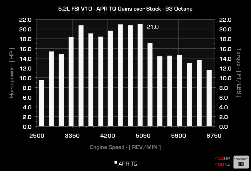 Úprava APR Stage I nezvedne pouze maximální výkon na 453 koní a 624Nm, ale přidá navíc až 28Nm točivého momentu, který je k dispozici v nižších otáčkách! APR Stage 1 úprava Řídící jednotky je jedna z nejlepších úprav v přepočtu ceny na každého přidaného koně pro motor 5,2 V10 FSI.
