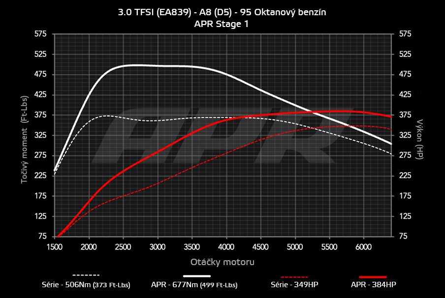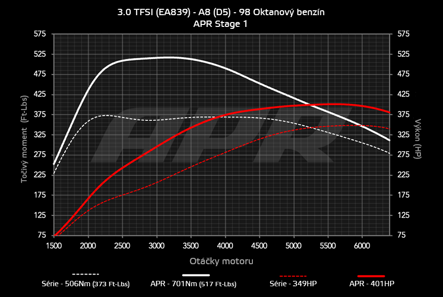 APR úprava řídící jednotky zprostředkuje excelentní skok jak u hodnot výkonu, tak i u točivého momentu, při zachování originálního nastavení mezních hodnot čidel klepání a dalších zabudovaných ochraných prvků. Výsledkem je bezpečné zvýšení výkonu, které je optimalizovano pro různé druhy paliva. U APR to nazýváme "výkon bez kompromisů".