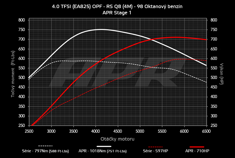 APR Stage 1 Chiptuning je jedna z nejlepších úprav v přepočtu ceny na každého přidaného koně pro motor 4,0 TFSI 441kW. APR Stage I Úprava Řídící jednotky je navržena pro seriový motor bez potřeby dalších mechanických úprav. S pouhou úpravou řídící jednotky, APR kalibrační inženýři naměřili vyšší maximální výkon 710 koní a točivý moment 1018Nm za použití 98 oktanového paliva. Velký nárust výkonu a točivého momentu je v celém spektru otáček a dosahuje až +146 koní a 227 Nm.