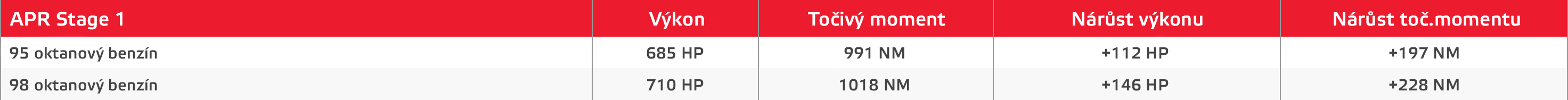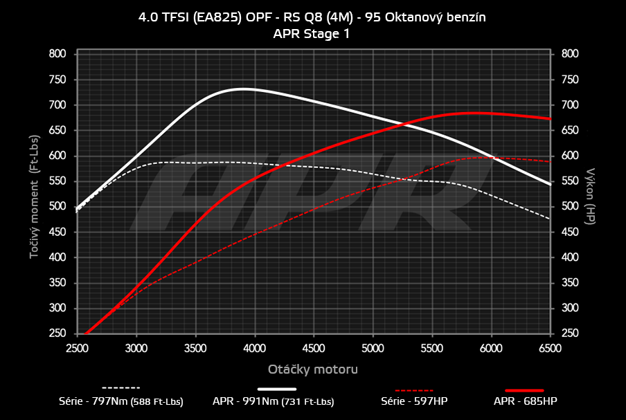 APR úprava řídící jednotky zprostředkuje excelentní skok jak u hodnot výkonu, tak i u točivého momentu, při zachování originálního nastavení mezních hodnot čidel klepání a dalších zabudovaných ochraných prvků. Výsledkem je bezpečné zvýšení výkonu, které je optimalizovano pro různé druhy paliva. U APR to nazýváme "výkon bez kompromisů".