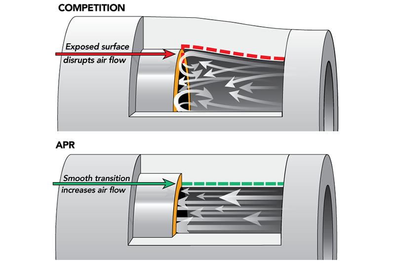 APR Inženýři udělali několik kroků při optimalizaci tlakových hadic, aby minimalizovali možnost úniků tlaku, snížili turbulence uvnitř vedení a zamezili dalším výkon-beroucím neduhům. Čtyř-vrstvý silikon byl použit za účelem dosažení požadované tloušťky hadic a nezbytné pevnosti, aby s rezervou vydržel i ty nejvyšší výkony, kterých lze na tomto motoru dosáhnout. Fluorosilikonová vnitřní vrstva byla přidána, aby se zajistila odolnost vůči oleji a palivu, které se mohou do hadic dostat skrze originální PCV ventil a EVAP systém. Dodávané Clampco T-Bolt sponky zajišťují, aby se hadice udržely navlečené na pevném vedení i při extrémních tlakových výkyvech ve vedení a za extrémních teplot. APR EZ-Flow design spojů umožňuje hladké proudění vzduchu skrz vedení bez nežádoucích turbulencí a bez dalších výkonových ztrát. Výsledkem je hadicový kit, který nahrazuje originální gumové hadice, zajistí udržení výkonu při delší živostnosti a navíc skvěle vypadají.