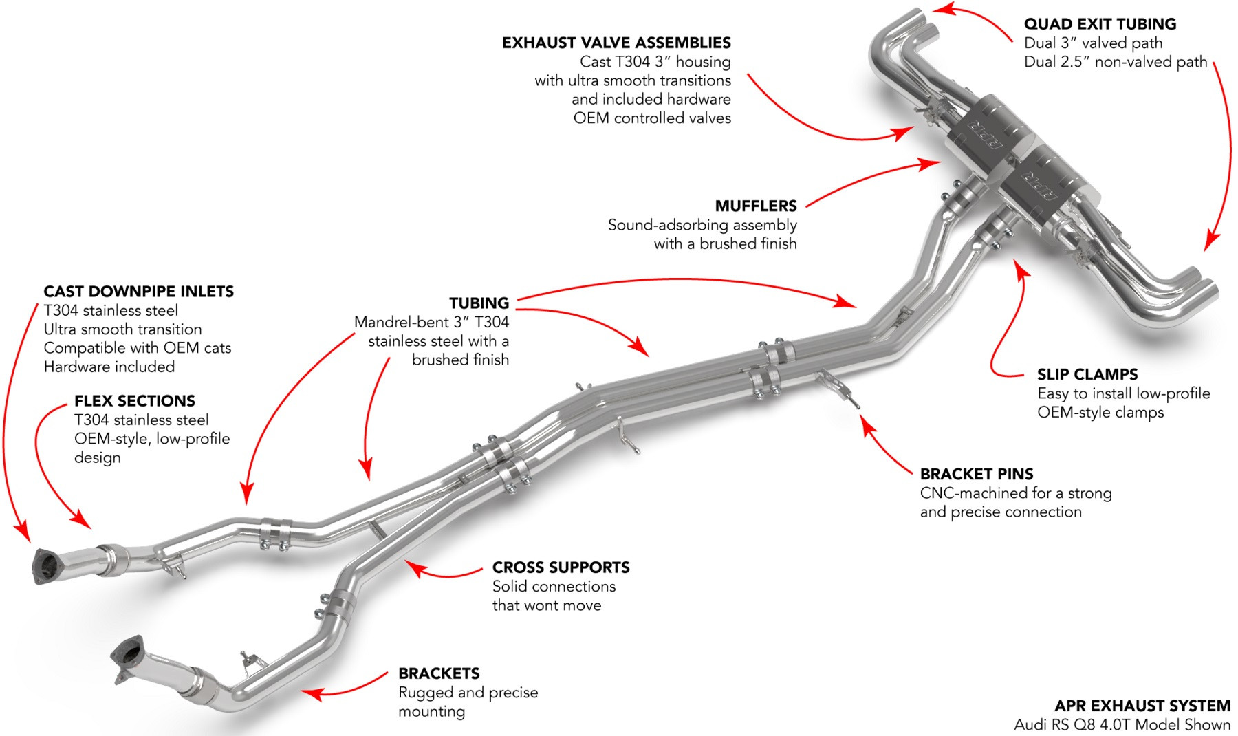 Prémiový celonerezový výfukový systém pro AUDI RSQ8 má precizně zpracované vedení stejné délky, odlité příruby pro hladký přechod od seriový katalyzátorů do APR výfuku a zvětšené vedení na 76mm. Celonerezová T304 strojově ohýbaná konstrukce s kvalitními TIG sváry. Klapky mají odlité tělo a zahrnují kvalitní komponenty s robustní konstrukcí pro maximální životnost. Veškeré držáky jsou CNC naohýbány a laserově vyříznuty pro maximální presnost a snadnost montáže celého výfuku. Veškeré tyto vlastnosti zajišťují to, aby tento výfuk šel snadno namontovat, měl větší propustnost, podpořil vyšší výkon, vážil méně jak originální díl a zněl perfektně v každém směru, zvlaště pak s úpravou řídící jednotky od APR.