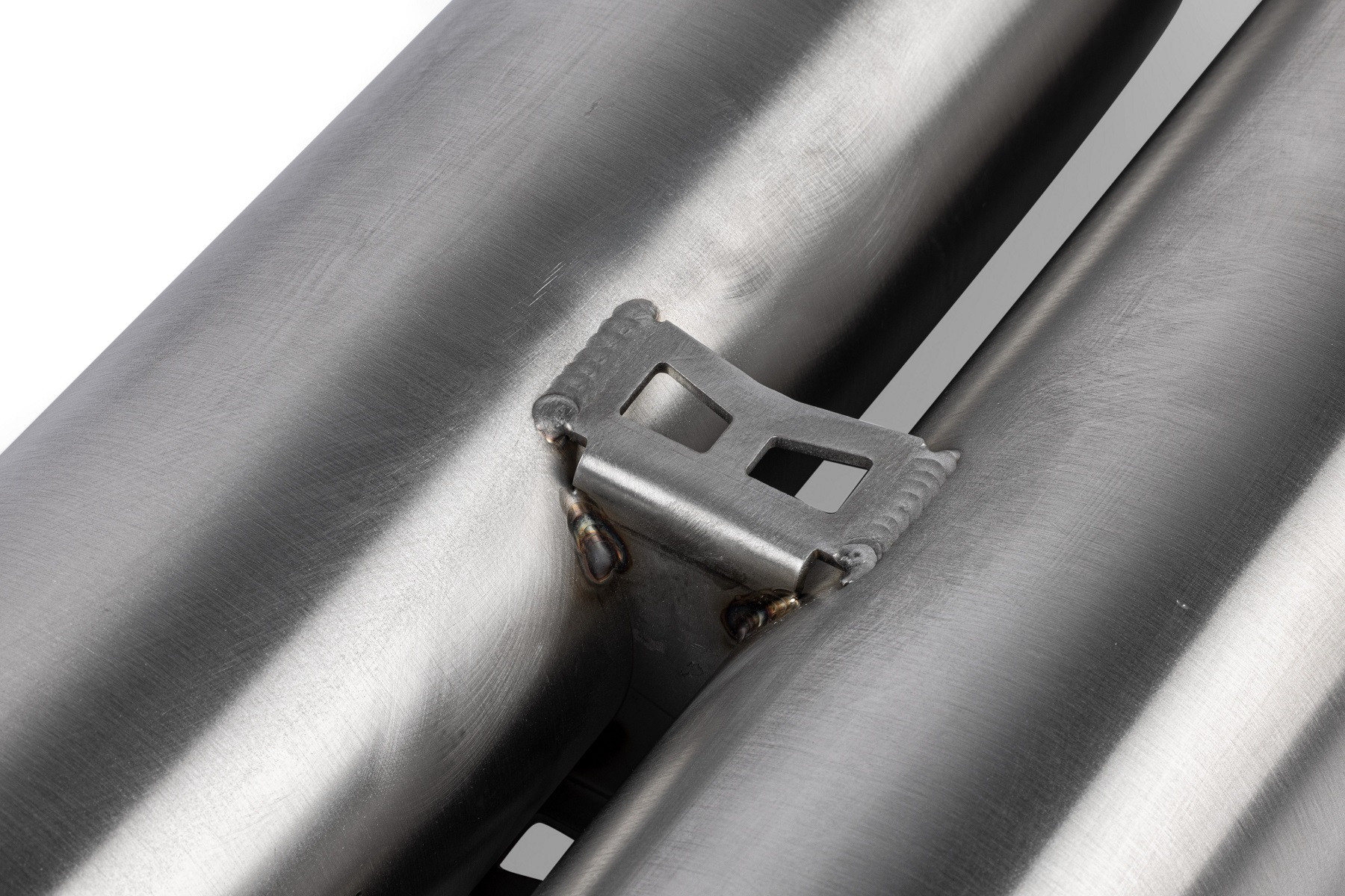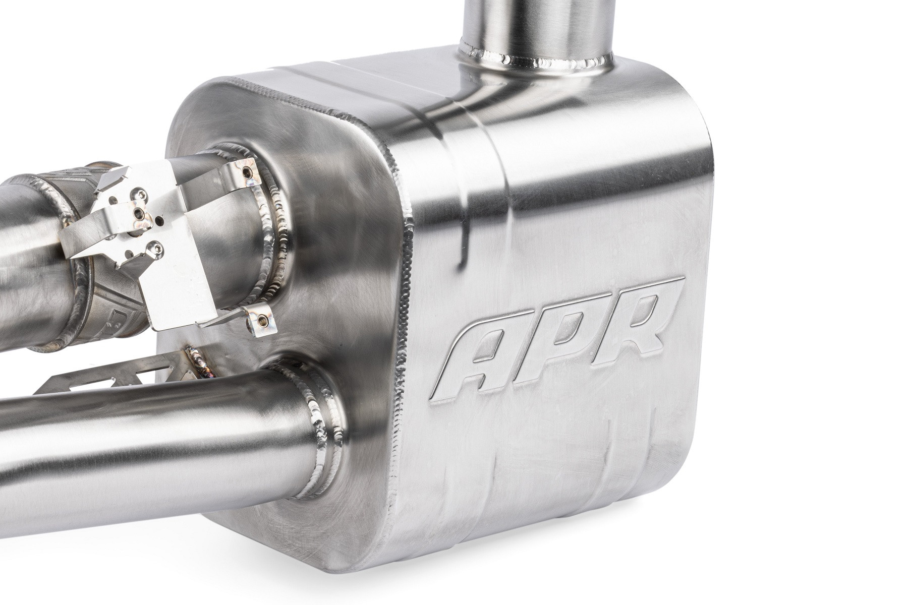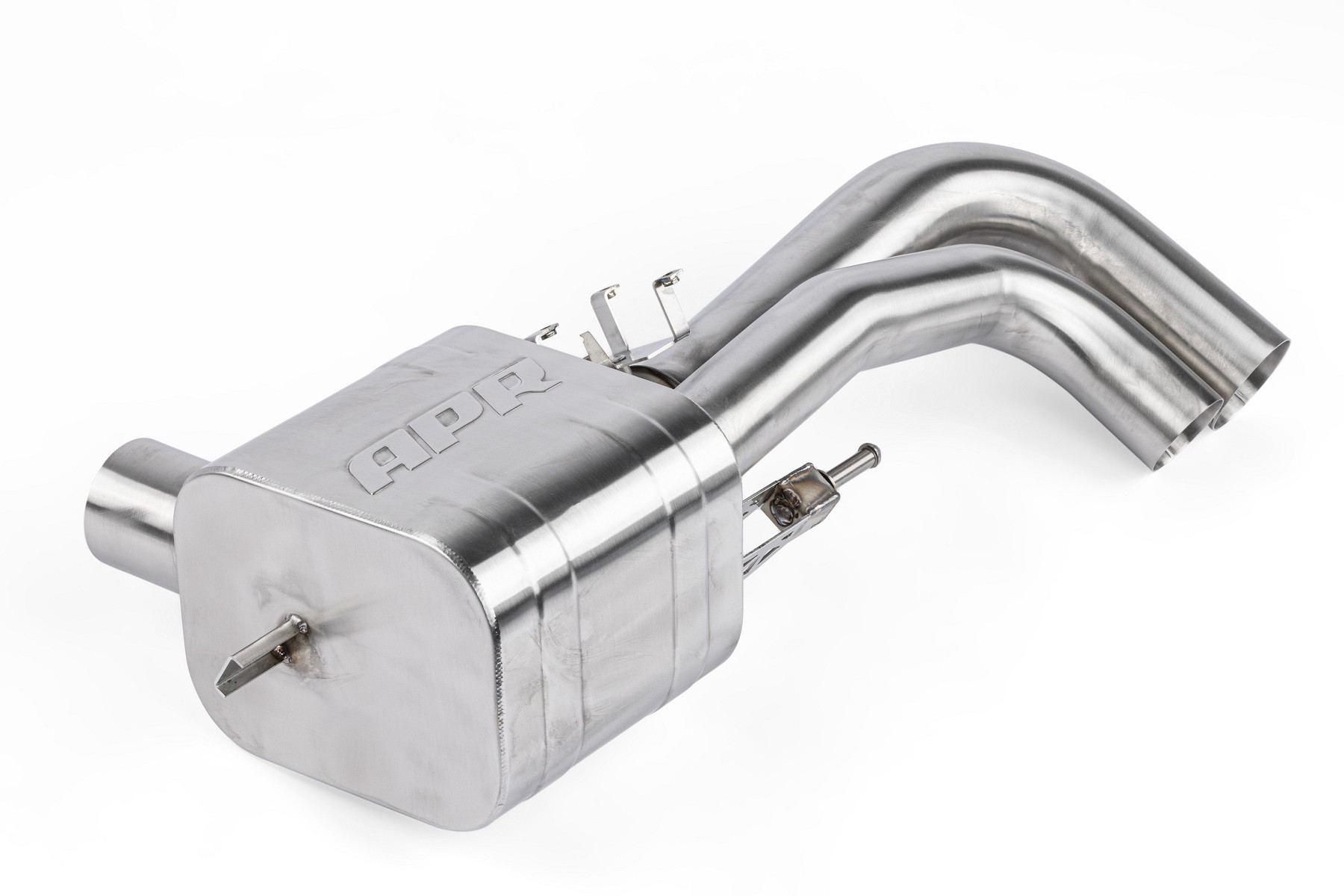 APR výfuk je vyrobený z kvalitní nerezové T304 oceli, která je strojově naohýbaná tak, aby byl prúchod spalin co nejpřímější. Jednotlivé části jsou svařené technologií TIG s foukáním argonu pro dosažení co nejhladčích svárů. Díky přesným držákům padne výfuk na originální uchycení bez potřeby dalších úprav. Výfuk začíná již hned za filtry pevných částic, takže nijak neovlivňuje emise vozu a je napojený přes odlité příruby, které zajistí extrémně hladký přechod mezi originálním downpipe a tímto sportovním výfukem. Celý výfuk ústí do sportovních tlumičů, ve kterých se rozdvojuje vedení na neklapkové tiché 2,5" vedení a klapkové hlasité vedení o průměru 3". Během klidné jízdy budou klapky zavřené a výfuk tak bude extrémně komfortní a neobtěžující. Ve sportovním módu nebo při plném plynu se pak klapky otevřou a zprostředkují úžasný zvukový projev V8.