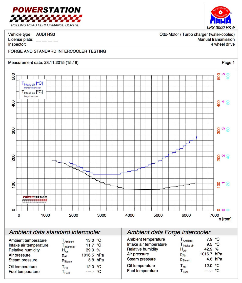 Na přiloženém grafu můžete vidět rozdíl v chlazení mezi originálním chladičm a Intercooler kitem od Forge Motorsport. Se standartním chladičem se u Audi RS3 2,5 TFSI 70hp naměřilo 362hp při 58°C teploty nasávaného vzduchu. Při pouhé změně chladiče za Forge Intercooler kit se naměřilo 386hp při teplotě 23°C. 24hp nárůst výkonu a o 35°C nižší teplota nasávaného vzduchu je obrovský rozdíl, když se vezme v potaz, to že jde o pouhou výměnu chladiče. S úpravou APR Stage 1 - 2+ bude zvýšení výkonu a snížení teploty nasávaného vzduchu oproti sériovému chladiči mnohem větší.