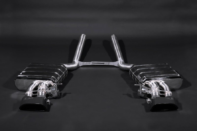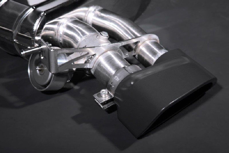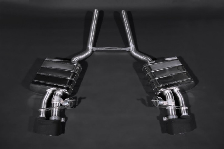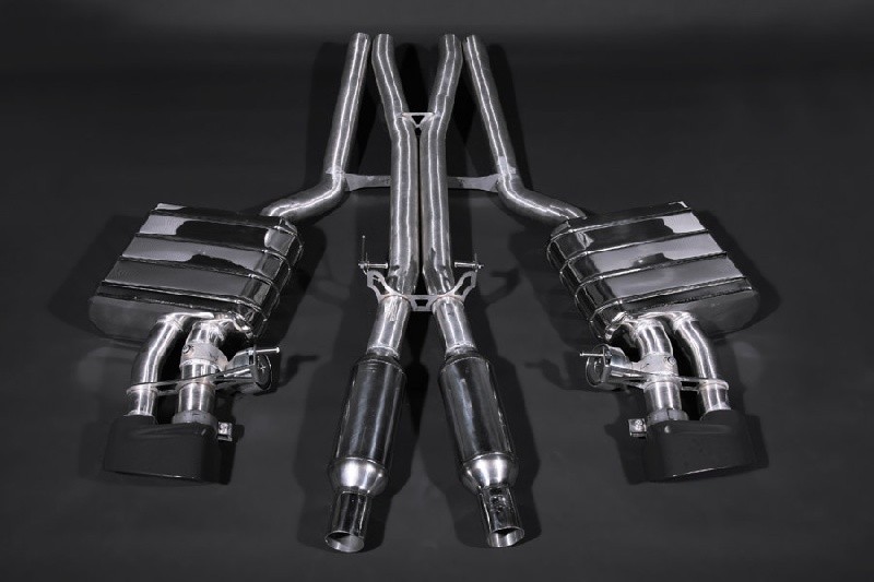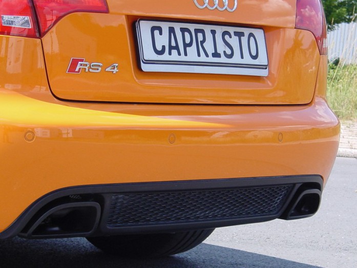 Výfukový systém pro AUDI RS4 4,2 FSI V8 vyrobený z T309 nerezové oceli s leštěným povrchem. Koncovky výfuku jsou CNC opracované s černým keramickým povrchem. Výfukový systém se ovládá stejně jako seriový výfuk, kdy se podtlakové hadičky pro ovládání klapkek jednoduše zapojí do nového Capristo výfuku.