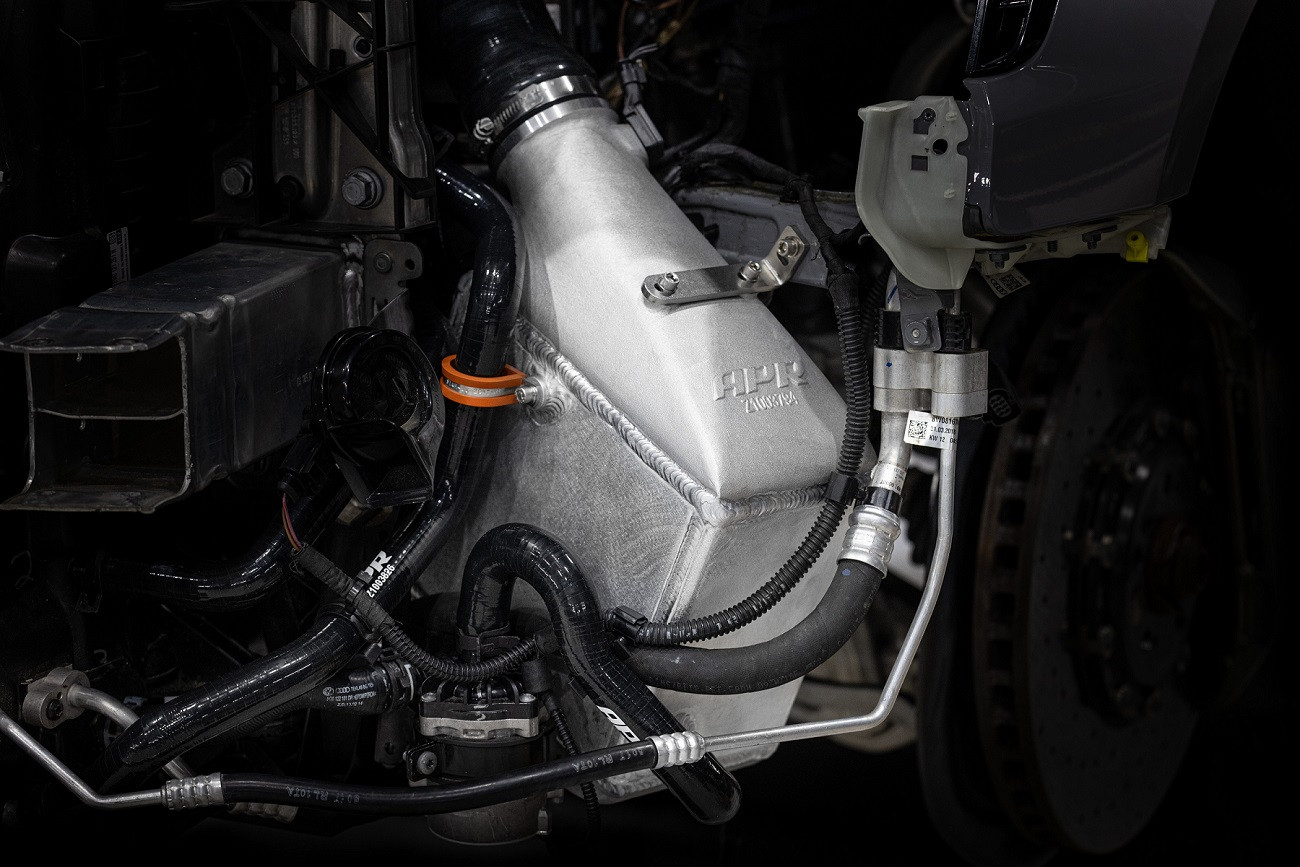 APR jádro chladiče je masivní, využívá přepážkového designu s chladícími žebry (bar-and-plate), které jsou hustě poskládané a zvlněné jako žaluzie. Tento tvar nabízí výjmečnou chladící schopnost a zároveň je vyvážený s ohledem na minimalizaci tlakových ztrát a hladké proudění vzduchu skz ně. Velikost jádra byla vybrána přímo pro tuto platformu tak, aby se zajistila minimalizace tlakových ztrát a zbyl ještě dostatek místa pro adekvátně tvarované bočnice. APR chladič dalece přesahuje možnosti originálních chladičů a představuje tak nejúčinnější chladič pro motor 3.0 TFSI. Pro řidiče to znamená jediné. Konstantní výkon i v těch nejnáročnějších podmínkách.