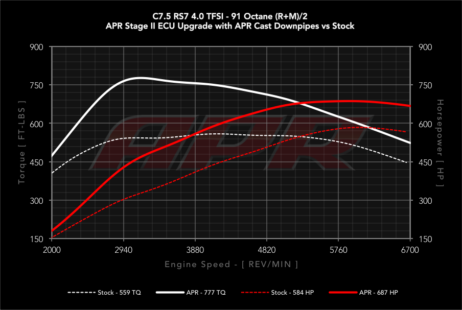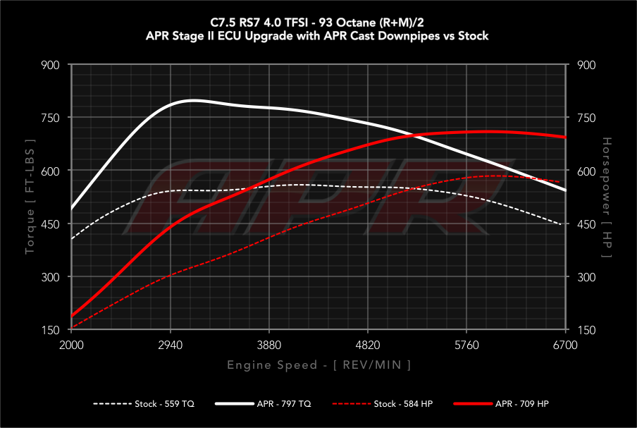 Úprava APR Stage 2 nezvedne pouze maximální výkon až na 709 koní a 1080Nm (98oct), ale přidá navíc až 344Nm točivého momentu, který je k dispozici v nejnižších otáčkách! APR Stage 2 úprava Řídící jednotky je jedna z nejlepších úprav v přepočtu ceny na každého přidaného koně pro motor 4,0 V8 TFSI.