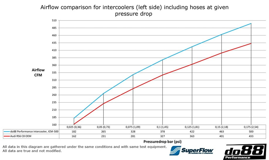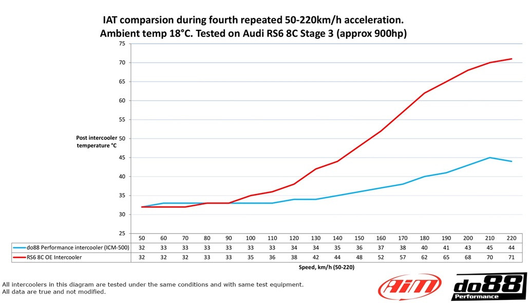 Vždy mějte na paměti, že originální intercoolery byly navrženy pro originální výkon s důrazem na nízké výrobní náklady a se záměrným omezením točivého momentu pro dosažení papírových emisí a požadovaného průběhu výkonu. Zvýšení výkonu nebo tvrdé použití v teplých dnech může způsobit, že seriový intercooler již bude brzdit výkon a vytvářet větší stres na komponenty, než v přápadě použití do88 Intercooler kitu. Tento IC bude mít přínos již u seriového motoru. Čím výše s výkonem půjdete, tím vyšší výkonový přínos bude, oproti seriovému chladiči, mít.