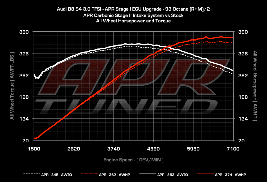 Originální sání obsahuje rezonanční perforaci ve vedení mezi filterboxem a škrtící klapkou, které tlumí zvuk kompresoru. APR Carbonio sání nahrazuje pouze originální filterbox a přidává tak 11 koní (výkon měřen na kolech). Stage II upgrade pipe kombinuje Stage I APR Carbonio Airbox s karbonovým nerestriktivním vedením ke škrtící klapce. S touto úpravou lze vidět nárust až 15 koní (výkon měřen na kolech).