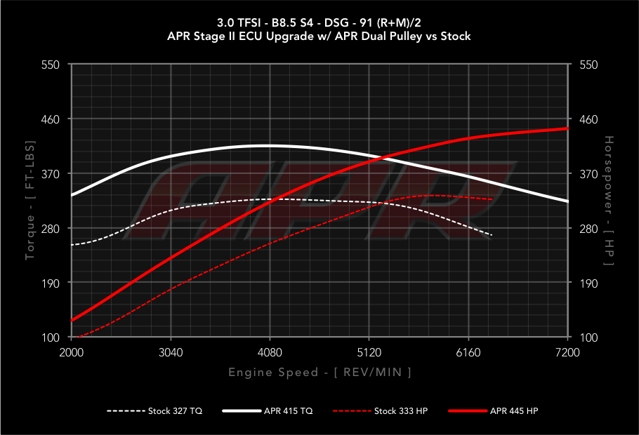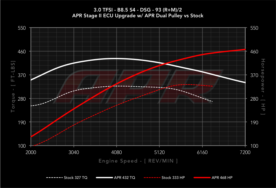 APR Stage 2 úprava řídící jednotky je vytvořena pro hladký chod s jednou, či objemi řemenicemi tak, aby využila plný výkonový potenciál tohoto vylepšení. Tato úprava je nadstavba nad APR Stage 1 úpravu. V případě, že již máte APR stage 1 úpravu, tak platíte jen doplatek rozdílu cen mezi APR Stage 1 a 2 úpravou.