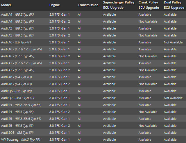 Tento produkt je navrhnut pro APR S Tronic TCU úpravu, díky které lze u automatické převodovky dosáhnout maximálního výkonu ve vysokých otáčkách. NGK BKR9EIX zapalovací svíčky s upraveným odtrhem na 0,6mm +/- 0,05mm a utáhlé momentem 30Nm jsou vyžadovány. APR Supercharger cooling system je vysoce doporučený při použití s oběmi řemenicemi. Teplota nasávaného vzduchu musí zůstat pod 75° C pro dosažení udávaných hodnot výkonu. APR Karbonové sání je také důrazně doporučeno pro dosažení udávaných hodnot výkonu při použití s oběmi řemenicemi. Pro nejlepší výsledky doporučuje APR odstranit ze sání sněžné přepážky.