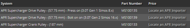 APR řemenice kompresoru snižuje průměr kopresorového kola ze seriových 63,25mm na 57,75mm. Ve výsledku tak dokáže čistě jen toto kolo roztočit kompresor o 9,5% rychleji. Ve spojení s APR Stage 2 úpravou řídící jednotky to pak znamená velký skok jak u výkonu, tak i u točivého momentu. Řemenice je vyrobena z nerezi CNC opracováním a potažena černou barvou pro nenápadný vzhled. Pro starší motory se montuje nalisováním MS100135 a na novějších motorech je uchycení pomocí čtyř šroubů MS100139.