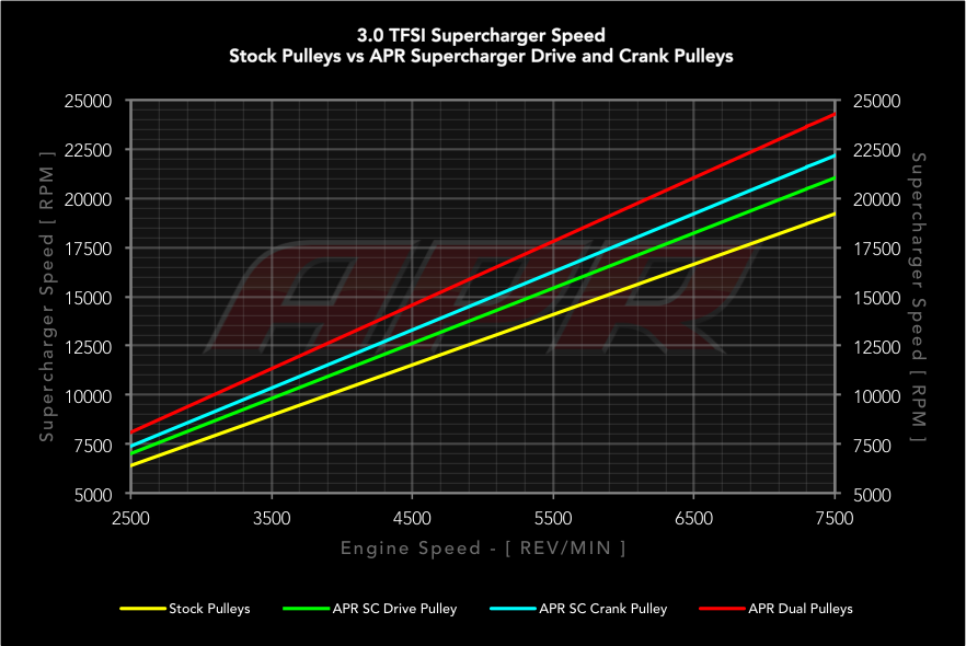APR řemenice kompresoru a klikové hřídele dramaticky zvyšují výkon a točivý moment motoru tím, že jiným zpřevodováním zvýší otáčky samotného kompresoru, který tak dokáže motoru dodat daleko více vzduchu. APR Stage 2 úprava řídící jednotky je vyžadována a zajistí správnou funkci motoru s těmito nově přidanými díly. Řemenice jsou prodávany odděleně a dovolují tak zvýšit výkon postupně nebo jen na požadovanou úroveň. Navíc tyto řemenice jsou nezbytné pro APR Ultracharger upgrade škrtící klapky, který ve finále s oběmi řemenicemi dokáže získat z motoru maximum výkonu tím, že se odstraní i poslední restrikce u vstupu do kompresoru.
