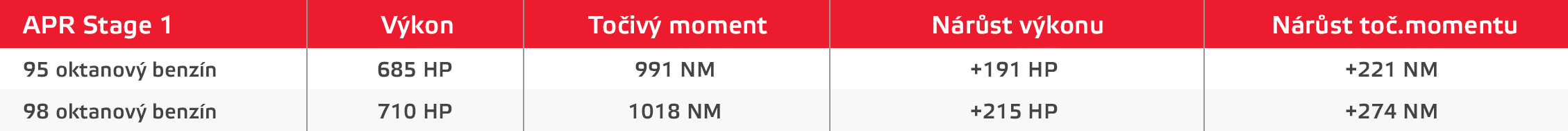 APR úprava řídící jednotky zprostředkuje excelentní skok jak u hodnot výkonu, tak i u točivého momentu, při zachování originálního nastavení mezních hodnot čidel klepání a dalších zabudovaných ochraných prvků. Výsledkem je bezpečné zvýšení výkonu, které je optimalizovano pro různé druhy paliva. U APR to nazýváme "výkon bez kompromisů". Úpravu lze dále doplnit například o APR Sportovní sání nebo APR Výkonnější zapalovací moduly.