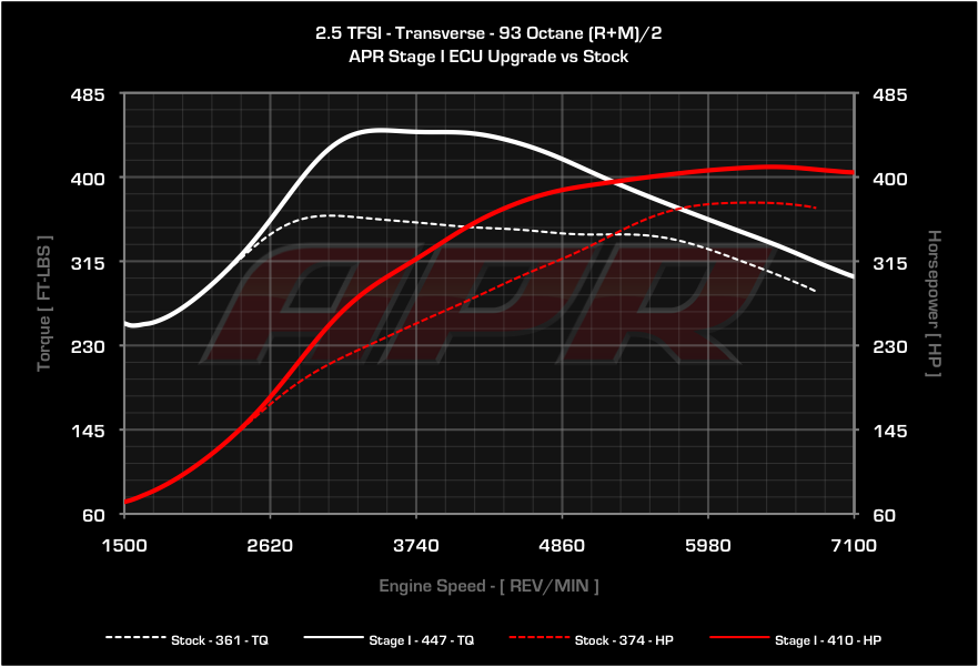 APR Stage 1 úprava Řídící jednotky je jedna z nejlepších úprav v přepočtu ceny na každého přidaného koně pro motor 2,5 TFSI, která mu dopřeje trochu více ostrosti, jakou by měl mít již z výroby, aniž by se motor hnal ke svým limitům. S průběhem výkonu, jako by byl z výroby a vylepšenými jízdními vlastnostmi, vyplní APR Stage I úprava Řídíci jednotky slabší místo v jinak excelentním autě.