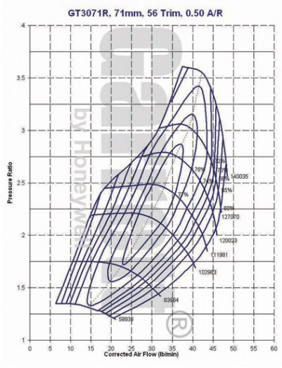 Originální turbodmychadlo s kuličkovými ložisky Garrett GT3071r. Turbodmychadlo je chlazeno vodou i olejem. Určeno pro motory o objemu 1.8-3.0L s výkonovým potenciálem až 480koní při tlaku max 2.6bar.