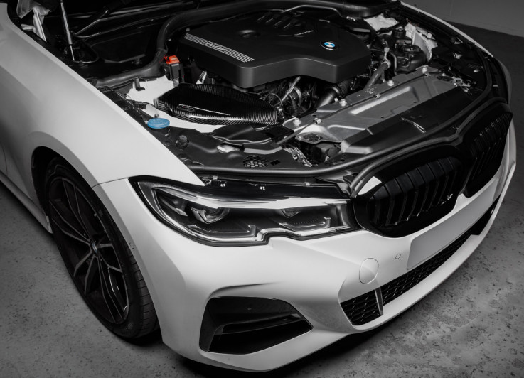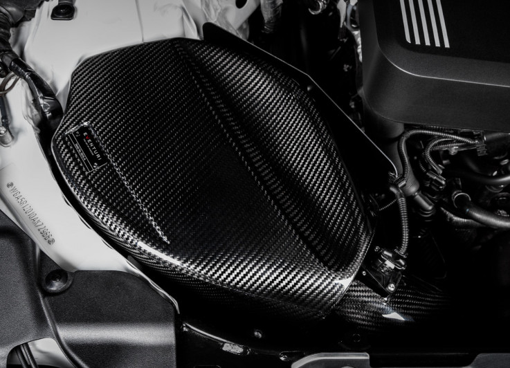 Eventuri kit sání pro BMW řady 3 a 4 G20/22 s motorem B48 je dalším z kompletních systémů vedení nasávaného vzduchu do motoru. Jedná se o kompletně uzavřený kit sání, který zajišťuje, že turbodmychadlo nenasává horký vzduch z motorového prostoru. Celé sání je navrženo tak, aby přivádělo vzduch do motoru co možná nejméně restriktivní cestou. Protože je sání umístěno v blízkosti výfukových svodů, je pro jeho funkci zcela zásadní přívod čerstvého vzduchu, který spolu s airboxem z prepreg karbonu udržuje teplotu nasávaného vzduchu na minimální možné úrovni. Kromě továrního přívodu vzduchu využívá Eventuri další zdroj v podobě otvoru v podběhu kola. Proti výfukovým svodům pak míří i tepelný štít se zlatou reflektivní tepelnou izolací.