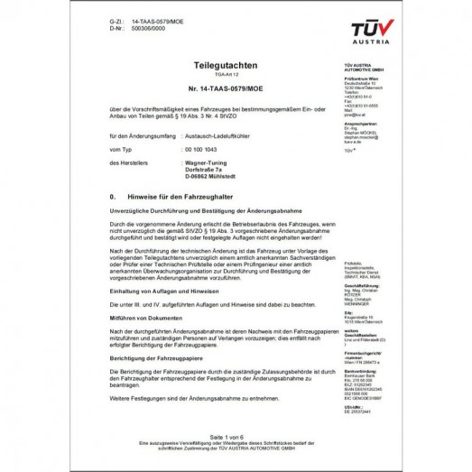 Vysoce výkonný intercooler od Wagner Tuning s rozměry (520x210x130mm) má v porovnání se seriovým chladičem o 64% větší čelní plochu a o 60% vyšší propustnost vzduchu. Inženýři u Wagner Tuning zvětšili rozměry, zvýšili efektivitu chladiče a vylepšili i bočnice s lepším usměrněním proudění vzduchu k chladiči. Došlo tak k odstranění všech seriových restrikcí a slabých míst, razantně se zlepšilo chlazení a snížily se tlakové ztráty. Tento Competition Intercooler využívá úspěchy ověnčené závodní jádro chladiče, které bylo primárně vyvinuto pro tyto aplikace. To je sestrojeno z nejkvalitnějšího chladiče druhu tube and fin (šachta s chladícími žebry) s odlitými hliníkovými bočnicemi, které obsahují usměrňovače vzduchu pro rovnoměrný přísun vzduchu k chladiči. Výsledkem je vysoká efektivita a nízké tlakové ztráty. Chladič je pevně spojený s originální výztuhou a váží pouhých 6,6 kg. Tento kit se montuje na místo originálního chladiče.