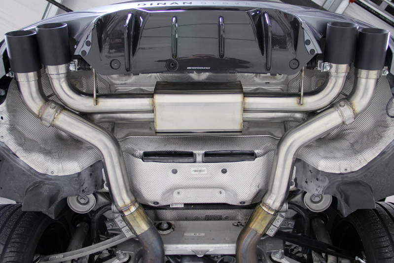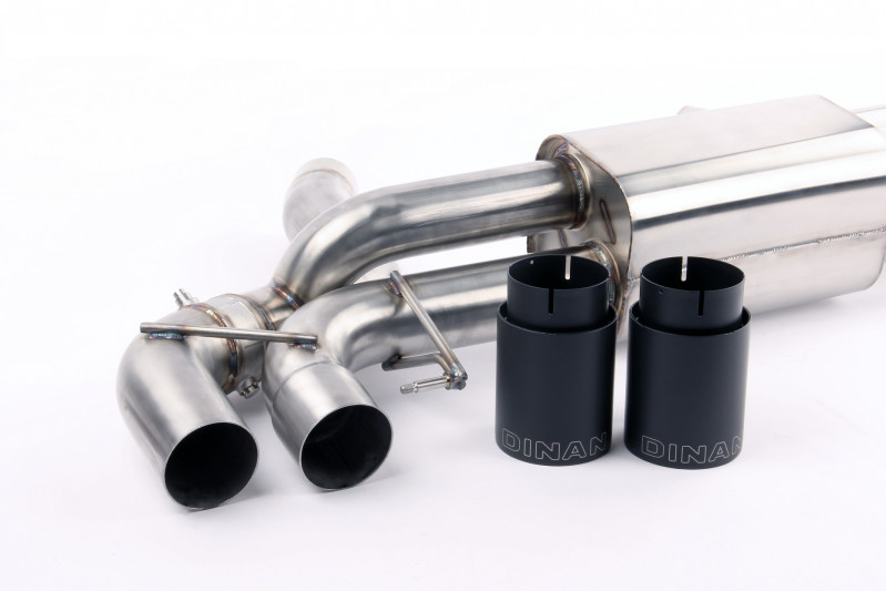DINAN Sportovní kapkový koncový tlumič výfuku. Tento plně průchozí tlumič výfuku je celonerezové T304 konstrukce a navržen tak, aby padl kus za kus místo sériového zadních tlumičů. Napojení na sériový výfuk je v oblasti zadní nápravy a napojuje se pomocí spon, které jsou součástí výfuku. Na druhé straně koncovky přesně ústí do otvoru v zadním nárazníku. Testování výkonu na motorové brzdě ukázalo nárůst výkonu 10hp, nicméně důležitější u tohoto dílu je naprostá změna zvuku. Sériová M5 nedává zvukově moc najevo, že jde o výkonově výjmečný vůz. Inženýři u DINAN se tedy rozhodly, že si toto auto lehce peprnější zvuk z výfuku zaslouží a podle toho vyvinuli svůj výfukový systém. Tlumič je navržen tak, aby poskytl agresivnější zvuk při plném plynu a zároveň maximálně snížil nepříjemné dunění a hlasitost při běžné klidné jízdě. To je dosaženo integrovanou Hemholtz rezonanční komorou v tlumičích. Výfukové plyny ústí do větších černých koncovek výfuku.