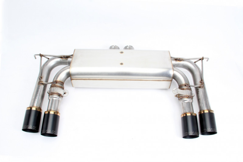DINAN Sportovní kapkový koncový tlumič výfuku. Tento plně průchozí tlumič výfuku je celonerezové T304 konstrukce a navržen tak, aby padl kus za kus místo sériového zadních tlumičů. Napojení na sériový výfuk je v oblasti zadní nápravy a napojuje se pomocí spon, které jsou součástí výfuku. Na druhé straně koncovky přesně ústí do otvoru v zadním nárazníku. Testování výkonu na motorové brzdě ukázalo nárůst výkonu 8hp, nicméně důležitější u tohoto dílu je naprostá změna zvuku. Sériové X5M a X6M nedávají zvukově moc najevo, že jde o výkonově výjmečný vůz. Inženýři u DINAN se tedy rozhodly, že si toto auto lehce peprnější zvuk z výfuku zaslouží a podle toho vyvinuli svůj výfukový systém. Tlumič je navržen tak, aby poskytl agresivnější zvuk při plném plynu a zároveň maximálně snížil nepříjemné dunění a hlasitost při běžné klidné jízdě. To je dosaženo integrovanou Hemholtz rezonanční komorou v tlumičích. Výfukové plyny ústí do větších černých koncovek výfuku.