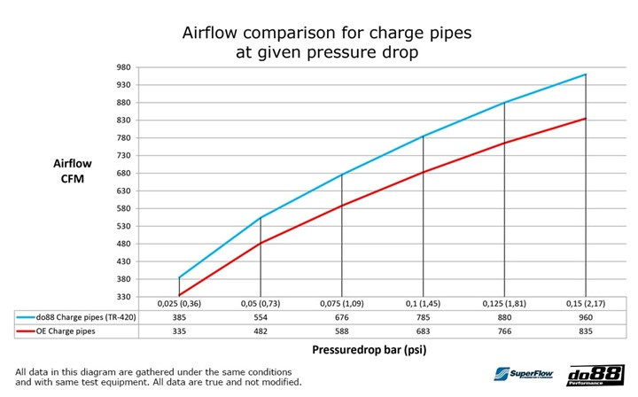 Do88 tlakové vedení má výrazně lepší průtok vzduchu než originální potrubí. To bylo ověřeno v několika testech, jak v autě, tak na do88 vlastním měřicím zařízení SuperFlow SF-1020.