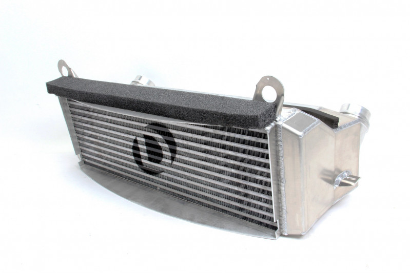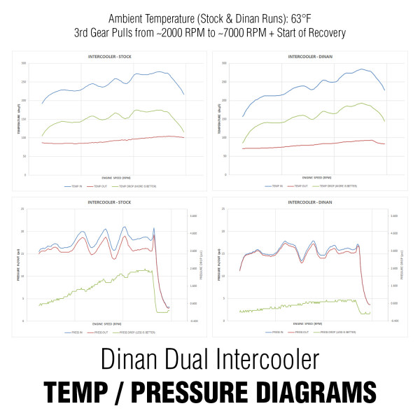 Při zvýšení plnícího tlaku turbodmychadla za účelem zvýšení výkonu, roste i teplota nasávaného vzduchu, která naopak výkon degraduje. Zvětšený intercooler pomáhá snížit teplotu nasávaného vzduchu a tím tak dokáže přidat další výkon. DINAN dvoujádrový intercooler má o 278% větší čelní plochu a spolu se zvětšeným objemem chladiče dramaticky snižuje jak teplotu nasávaného vzduchu, tak i odpor, který originální chladič v tlakovém vedení vytváří. Tlaková ztráta tak klesla o 69% na 0,055bar, což má za následek konzistentní snížení teplot nasávaného vzduchu o 39% a zkrácení doby, kdy je chladič schopen vyšší teploty snížit. To se projeví hlavně při popojíždění s častým zastavováním, kdy auto bude moci využít plný výkon daleko dříve.