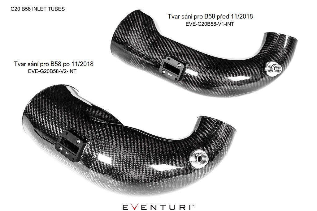 Originální sání BMW pro motory B58 bylo v listopadu 2018 upraveno a původní snímač množství nasávaného vzduchu byl nahrazen teplotním senzorem umístěným v sací trubici. Eventuri nabízí sání pro obě varianty. Sání V1 obsahuje přírubu určenou pro snímač množství nasávaného vzduchu, zatímco sání V2 má přírubu pro teplotní snímač (pro vozy vyrobené po listopadu 2018). Rozdíl mezi trubicemi je viditelný na obrázku níže:
