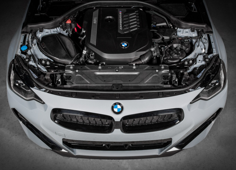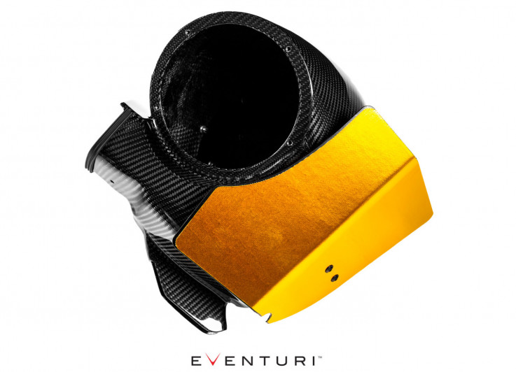 Eventuri kit sání pro BMW řady 3 a 4 G20/22 s motorem B58 je dalším z kompletních systémů vedení nasávaného vzduchu do motoru. Jedná se o kompletně uzavřený kit sání, který zajišťuje, že turbodmychadlo nenasává horký vzduch z motorového prostoru. Celé sání je navrženo tak, aby přivádělo vzduch do motoru co možná nejméně restriktivní cestou. Protože je sání umístěno v blízkosti výfukových svodů, je pro jeho funkci zcela zásadní přívod čerstvého vzduchu, který spolu s airboxem z prepreg karbonu udržuje teplotu nasávaného vzduchu na minimální možné úrovni. Kromě továrního přívodu vzduchu využívá Eventuri další zdroj v podobě otvoru v podběhu kola. Proti výfukovým svodům pak míří i tepelný štít se zlatou reflektivní tepelnou izolací.