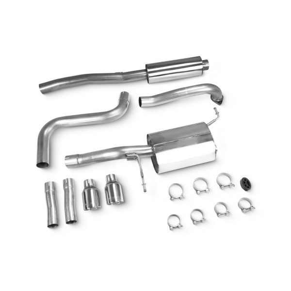 Catback výfuk Scorpion Exhaust vyrobený z nerezové oceli T304. Celý výfuk je tvořen ohýbaným vedením o průměru 63,5mm s průchozím absorbčním tlumičem / tlumiči (podle verze). Díky zlepšení proudění spalin a eliminaci zpětných tlaků dokáží výfuky Scorpion sprostředkovat jak maximální výkon, tak hlavně i pěkný jadrný zvuk.