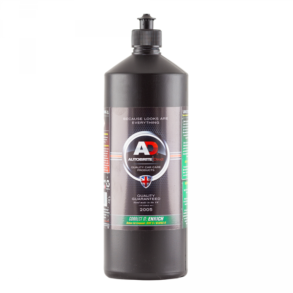 Enrich z koreční sady "Correct IT" výrobce Autobrite Direct je středně silná leštěnka schopná kompletně eliminovat hologramy, zmatnění, střední škrábance a stopy po broušení do hrubosti až P2500. Středně silné abrazivní složení leštěnky Enrich zanechá lak v perfektním stavu bez škrábanců a obohacený vysokým leskem.