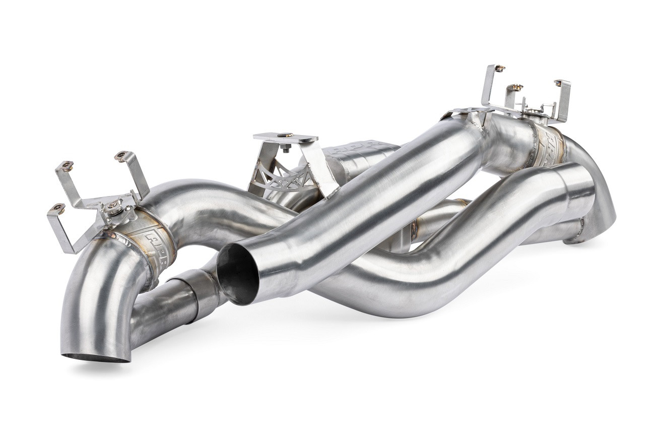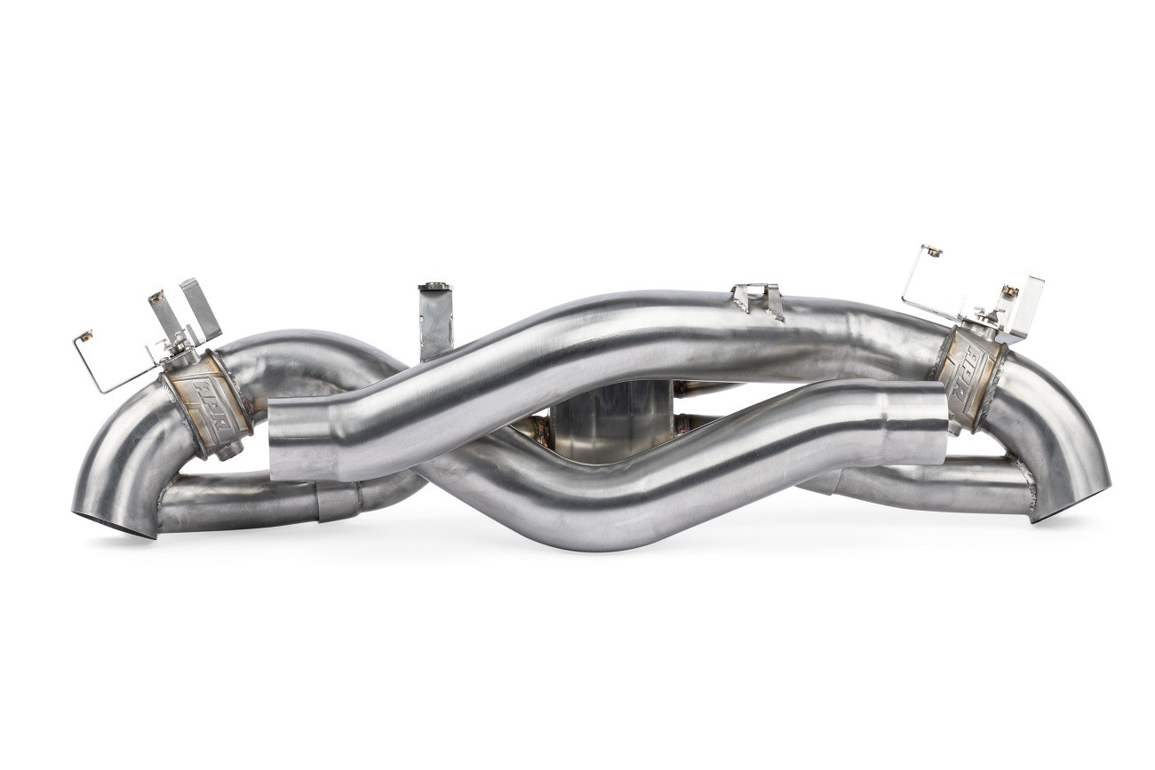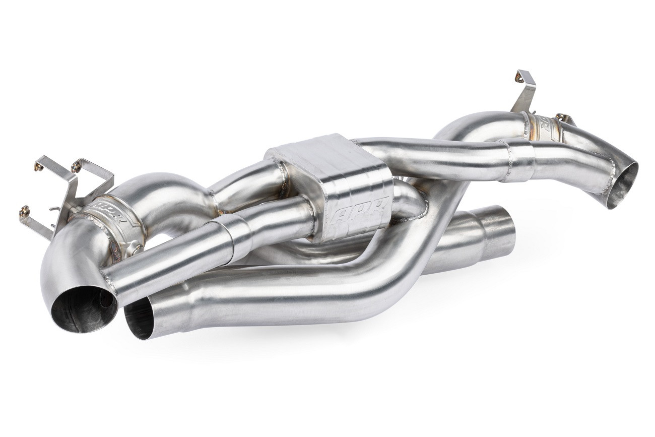 Prémiový celonerezový výfukový systém pro Porsche 911 992 má precizně zpracované vedení stejné délky, jak hlavních 76mm větví, tak tlumených 51mm vetví, které vytváří exotický zvukový projev vhodný vozů Porsche. Křížící se netlumené vedení zajišťuje potřebný výplach válců díky zvětšenému vedení o 19%, zatímco tlumené vedení s o 66% větším průchodem zajistí podporu pro tichou, ale stále svižnou jízdu. I přes zvětšené vedení je výfuk o 37% lehčí, jak seriový Porsche sportovní PSE výfuk. Výfuk tak dokáže zajistit jak vysoký výkon a důstojný zvukový doprovod, tak civilizované komfortní chování při klidné jízdě. Celonerezová T304 strojově ohýbaná konstrukce s kvalitními TIG sváry. Klapky mají odlité tělo a zahrnují kvalitní komponenty s robustní konstrukcí pro maximální životnost. Veškeré držáky jsou CNC naohýbány a laserově vyříznuty pro maximální presnost a snadnost montáže celého výfuku. Veškeré tyto vlastnosti zajišťují to, aby tento výfuk šel snadno namontovat, měl větší propustnost, podpořil vyšší výkon, vážil méně jak originální díl a zněl perfektně v každém směru, zvlaště pak s úpravou řídící jednotky od APR.