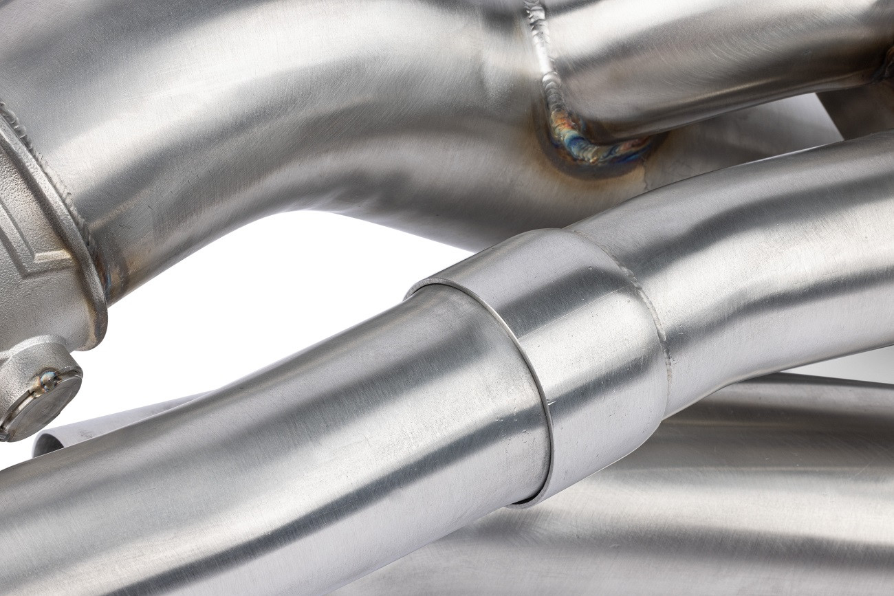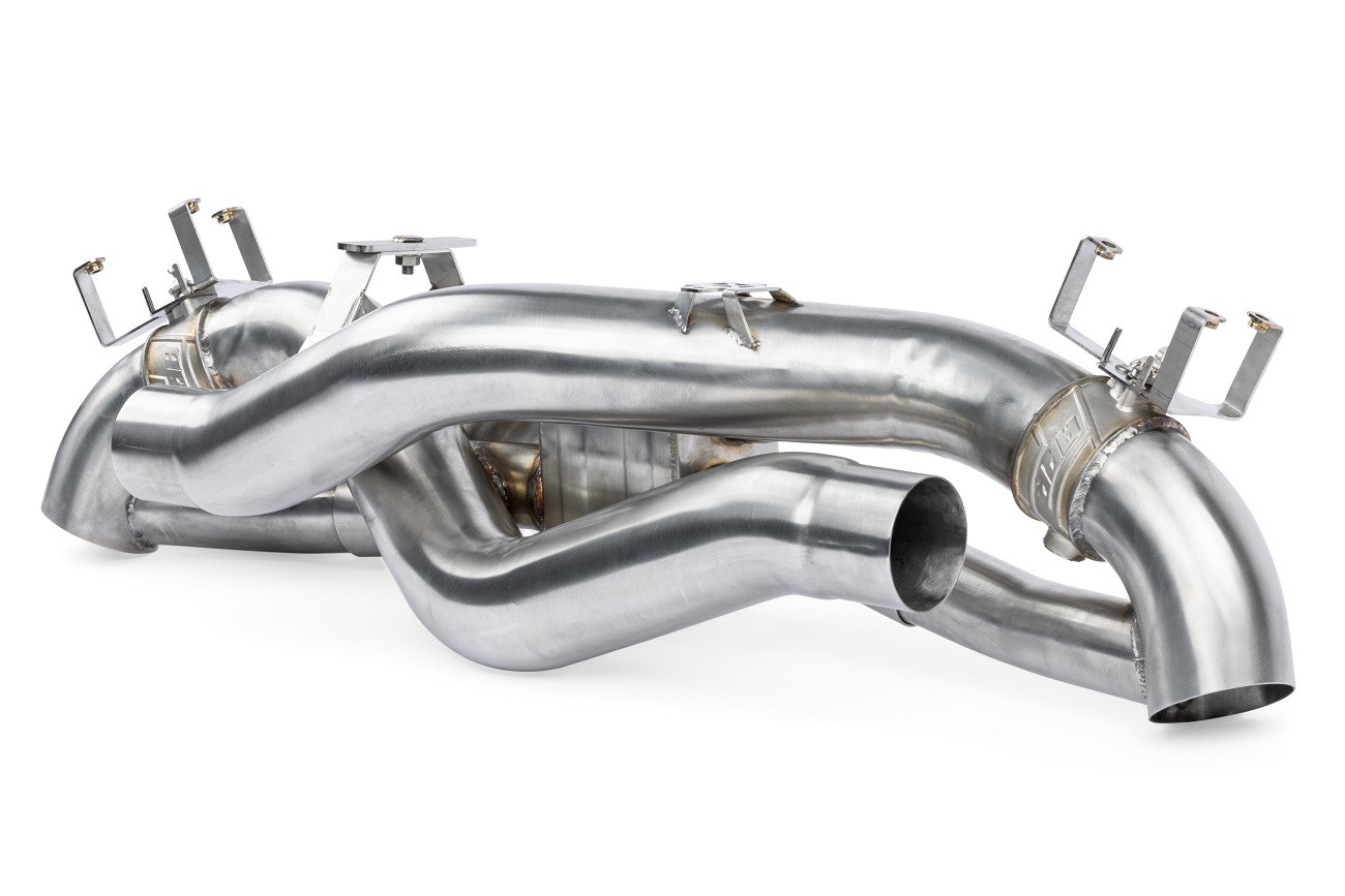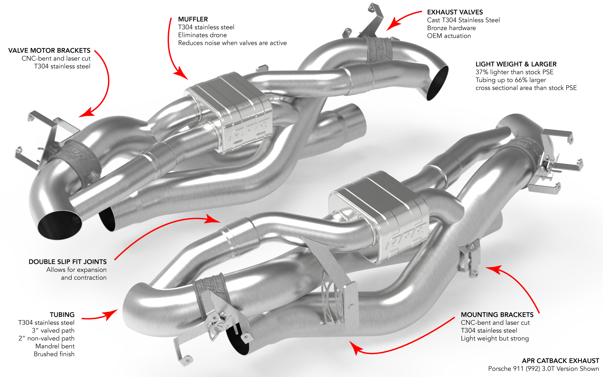Prémiový celonerezový výfukový systém pro Porsche 911 992 má precizně zpracované vedení stejné délky, jak hlavních 76mm větví, tak tlumených 51mm vetví, které vytváří exotický zvukový projev vhodný vozů Porsche. Křížící se netlumené vedení zajišťuje potřebný výplach válců díky zvětšenému vedení o 19%, zatímco tlumené vedení s o 66% větším průchodem zajistí podporu pro tichou, ale stále svižnou jízdu. I přes zvětšené vedení je výfuk o 37% lehčí, jak seriový Porsche sportovní PSE výfuk. Výfuk tak dokáže zajistit jak vysoký výkon a důstojný zvukový doprovod, tak civilizované komfortní chování při klidné jízdě. Celonerezová T304 strojově ohýbaná konstrukce s kvalitními TIG sváry. Klapky mají odlité tělo a zahrnují kvalitní komponenty s robustní konstrukcí pro maximální životnost. Veškeré držáky jsou CNC naohýbány a laserově vyříznuty pro maximální presnost a snadnost montáže celého výfuku. Veškeré tyto vlastnosti zajišťují to, aby tento výfuk šel snadno namontovat, měl větší propustnost, podpořil vyšší výkon, vážil méně jak originální díl a zněl perfektně v každém směru, zvlaště pak s úpravou řídící jednotky od APR.