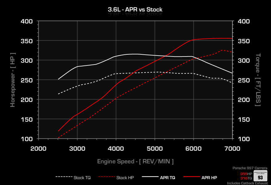 APR představuje úpravu řídící jednotky pro Porsche 911 (997) Carrera 3,6L. APR posouvá výkon přes 355hp a 428Nm při použití 98 oktanového paliva. Úprava dramaticky zvyšuje výkon a točivý moment, upravuje i dávkování výkonu skrze překalibrovaný chod plynového pedálu, který má nyní lineární charakteristiku. Takže jak sešlápnete pedál, tak bude i auto zrychlovat. Velký zřetel byl brán na hladký chod a vynikající denní použtelnost. Úprava při běžné provozu nikterak neomezuje, při klidné jízdě se vůz chová velmi přívětivě, jako kdyby tak vyjel již z továrny. Stačí ale trošku sešlápnout plynový pedál a okamžitě získáte dechberoucí akceleraci.