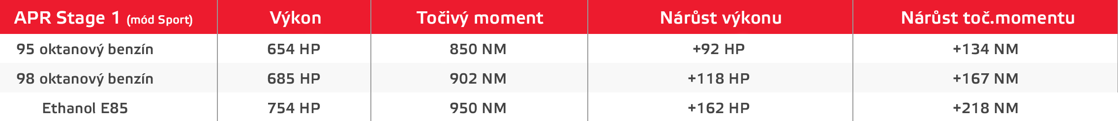 APR Stage 1 je první a zároveň největší krok, který vede k výraznému zvýšení výkonu. Tato na aplikaci jednoduchá úprava zvýší výkon až na 654-754 hp a 850-950Nm v závisloti na oktanové specifikaci paliva a zvolené mapě. Vůz může být osazen lepším sáním motoru, intercoolery a lepším výfukovým systémem pro dosažení ještě vyšších hodnot.