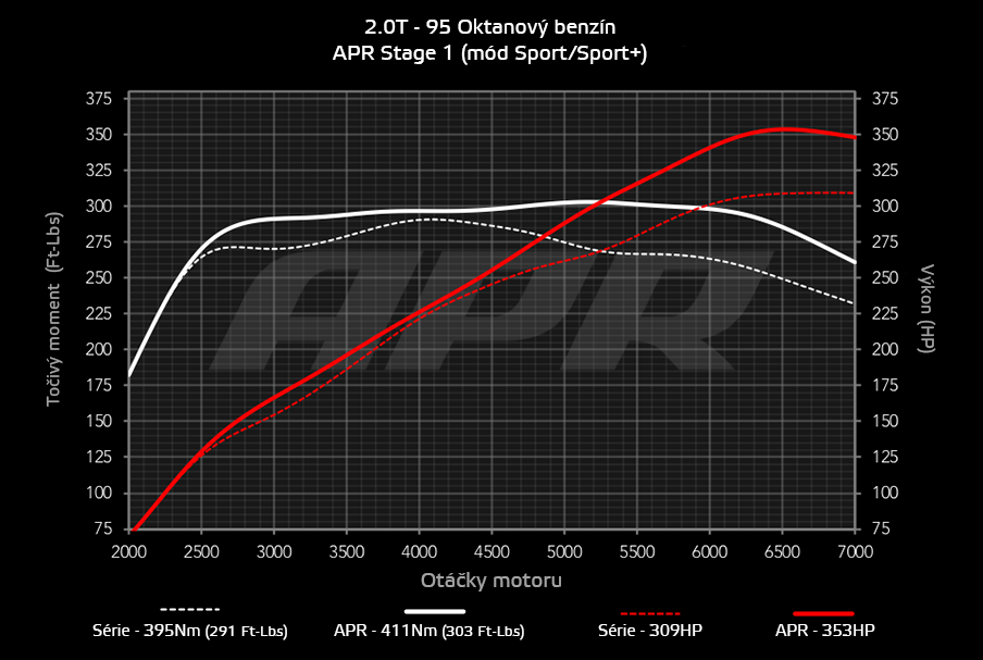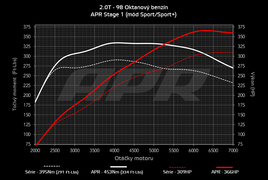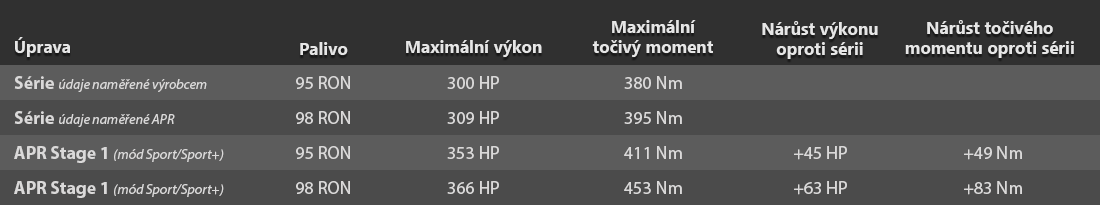 APR Stage 1 je první krok, který vede ke zvýšení výkonu. Tato na aplikaci jednoduchá úprava zvýší výkon na 353-366hp a 410-453Nm v závisloti na oktanové specifikaci paliva a zvolené mapě. Vůz může být osazen lepším sáním motoru a lepším výfukovým systémem.