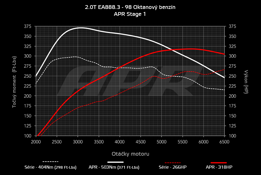 APR úprava řídící jednotky je nejefektivnější modifikace auta v poměru pořizovací ceny a přidaného výkonu u motoru 2,0T. Tyto úpravy dramaticky zvýší jak výkon, tak i točivý moment motoru, čímž získáte mnohem rychlejší a zábavnější vůz. Zlepšení je možné skrze APR optimalizaci seriové řídící jednotky vozu tak, aby se využil plný potenciál motoru. Úprava se nahrává do seriové řídící jednotky skrze OBD-II zásuvku, řídící jednotka se tedy nemusí fyzicky rozebírat.
