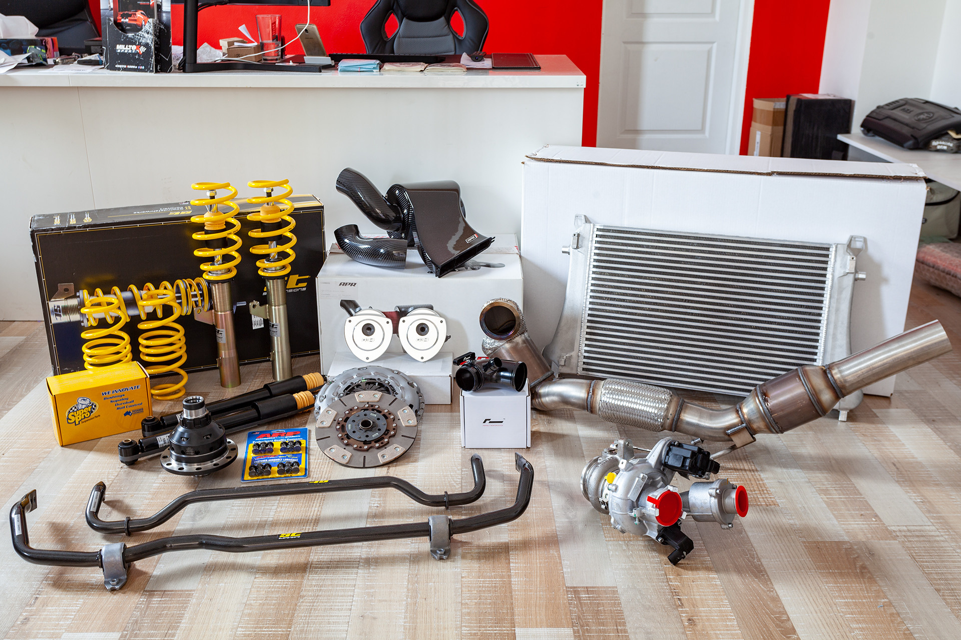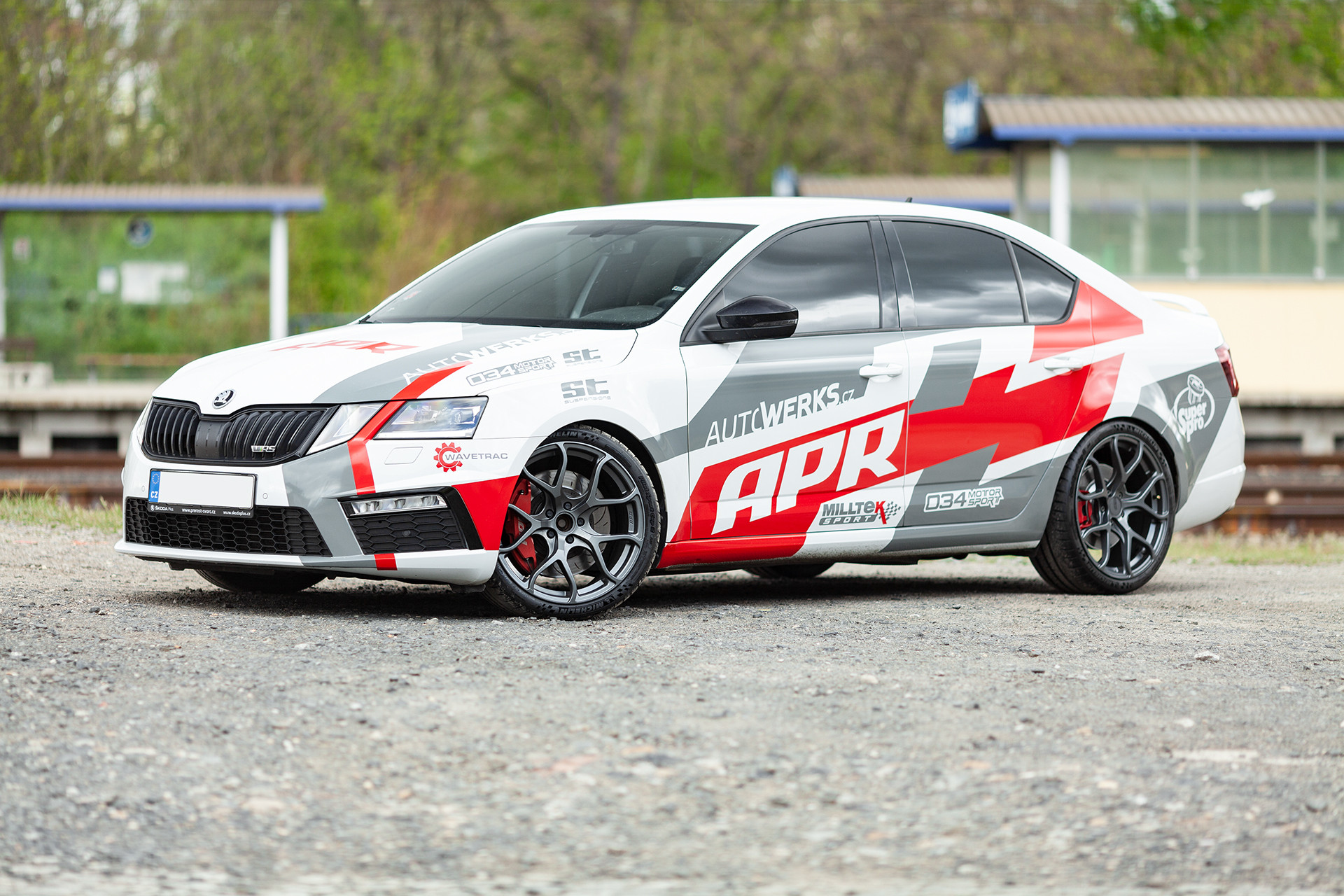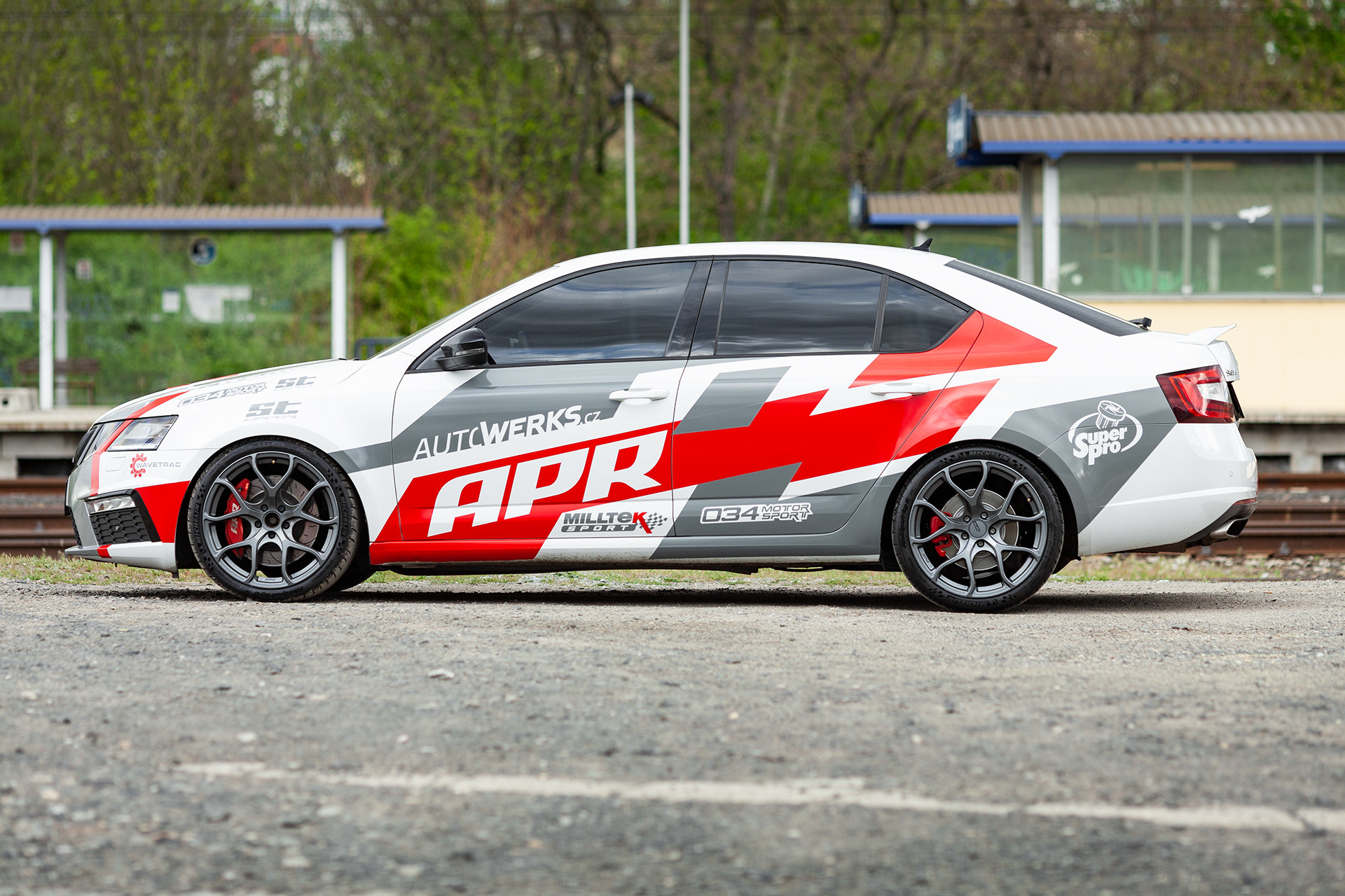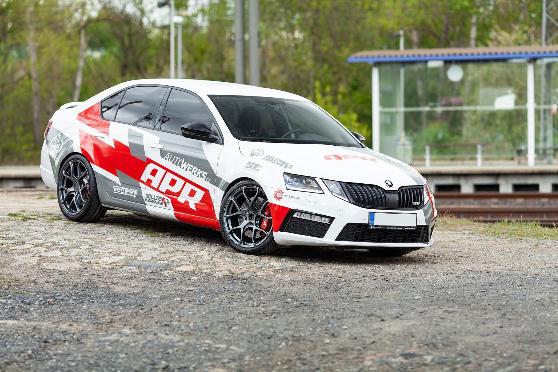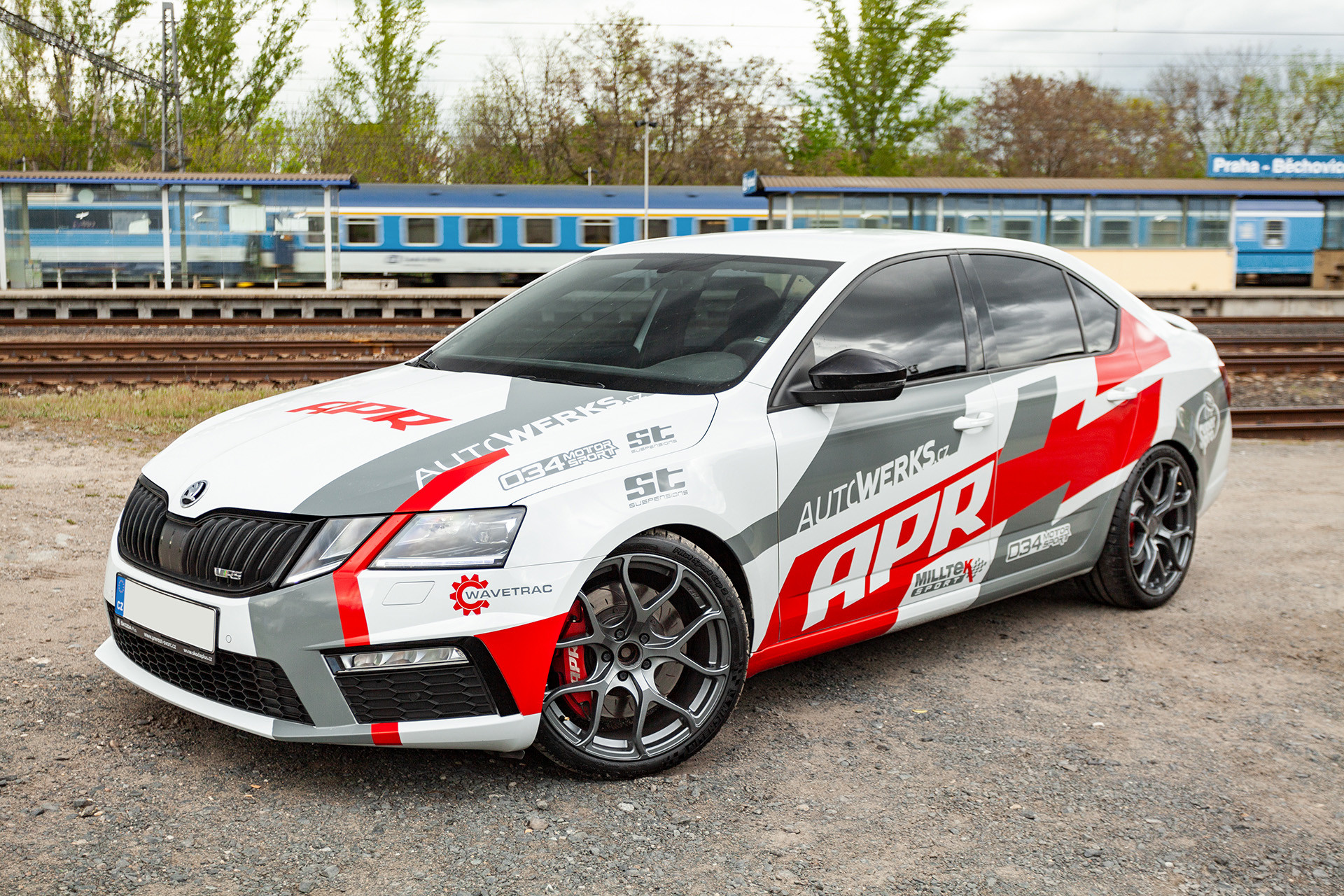 Vzhledem k tomu, že s autem chceme občas na okruh, tak jsme potřebovali velké brzdy, které by zvládaly vysoké teploty a neuvadaly by. Volba padla na kit od APR, který se skládá z 6ti pístkových třmenů a 350mm kotoučů, díky kterým se mohou dát na vůz stále 18" kola. To kdybychom to ježdění na okruhu brali více vážně :). I když se jedná o velké a schopné brzdy, tak i tak jsme jim pomohli s chlazením náfuky z AUDI RS3, které usměrňují proudění vzduchu k brzdám a dokáží tak snížit jejich teplotu až o 20%. Na zadní nápravě se vyměnily malé brzdy za větší ze Škody Octavia RS245, takže máme nyní i vzadu chlazené kotouče o průměru 310mm. Brzdy už by byly, takže jsme mohli přikročit k naladění poměru brzdného účinku, aby zadní brzdy brzdily o trochu více a povedlo se. Aniž by se nějak změnila stabilita vozu, tak po tomto našem jemném doladění jsme ještě dále výrazně zkrátili brzdou dráhu vozu. To jsou jemné detaily, které jinde nenajdete a my je nabízíme jen zákazníkům, kteří si objednají kompletní úpravu vozu u nás.