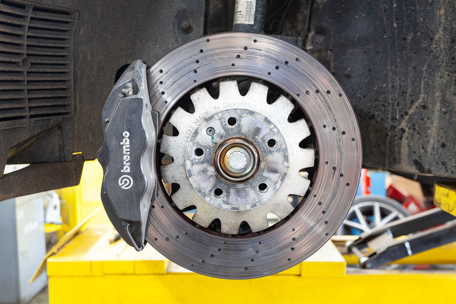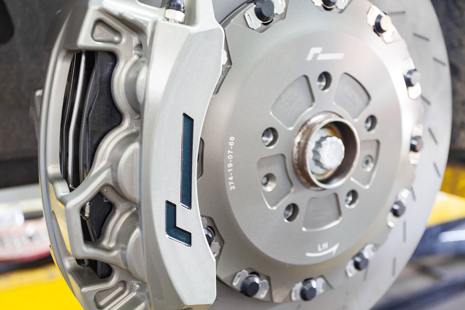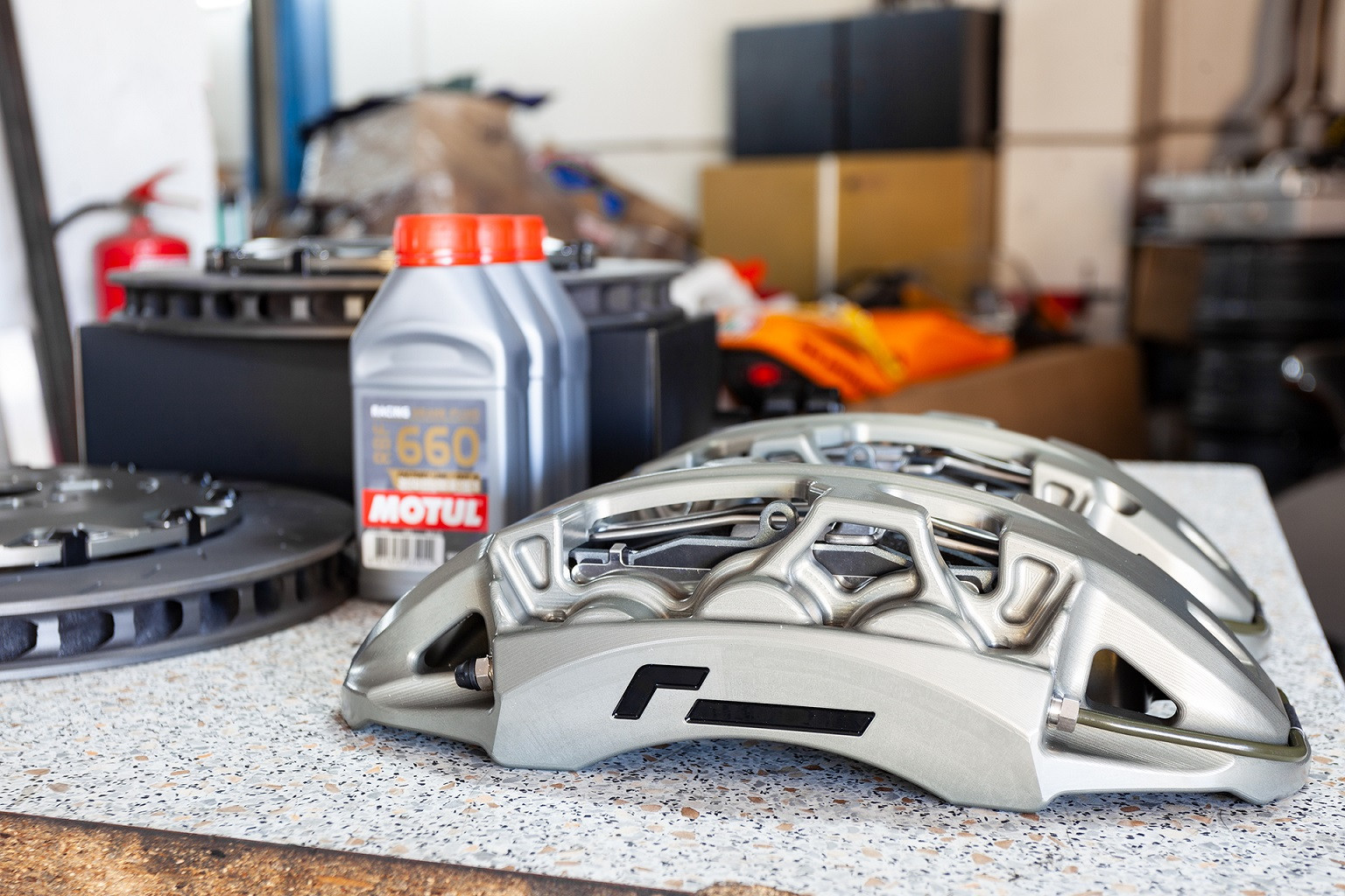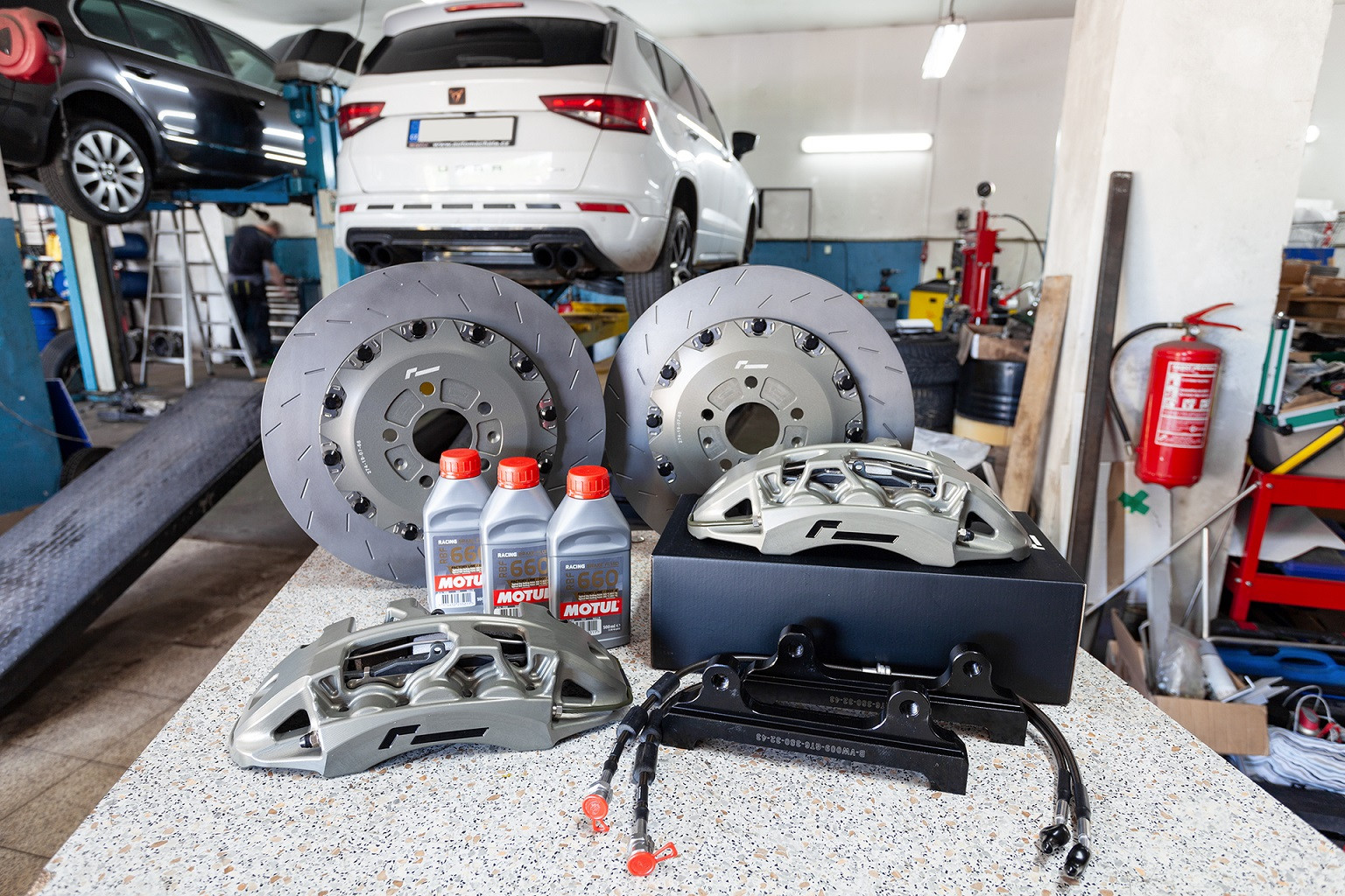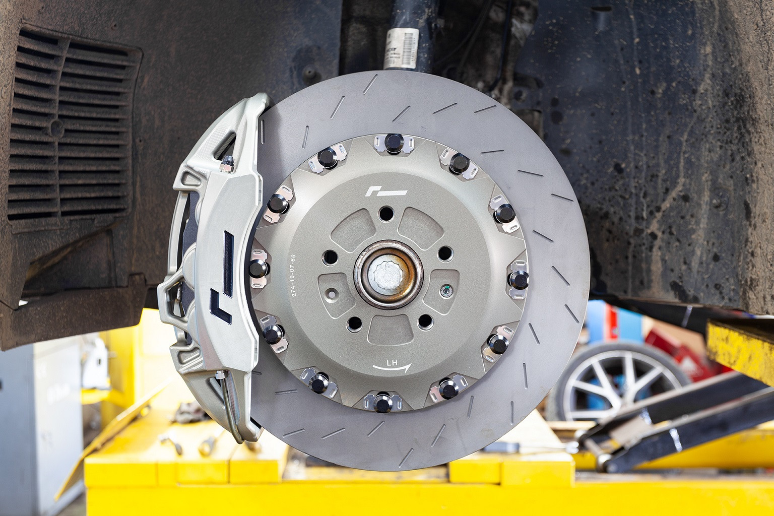 Takto upravené auto jsme posunuli z 300hp na luxusních 470hp a zrychlení ze 100 na 200 km/h jsme stáhli na 10,6s! S tím už se dá předjíždět! Problém ale občas nastane, když chcete tuto stodolu ubrzdit. Na to jsme našli lék v podobě velkých šestipístkových brzd s 380ti milimetrovými kotouči od Racingline. Brzdy nově nevadnou, dobře se dávkují a za předními koly skvěle vypadají!