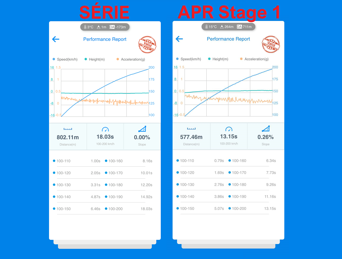 Od začátku bylo jasné, že zde nepůjde o nějakou výraznější úpravu, ale jen o doladění, aby byl vůz více příjemný a aby se zbavil několika neduhů. Prvním problémem byl výkon, který i přes slibných papírových 200kW, nebyl žádná slavá, viz graf zrychlení níže. Motor 2,0 TSI zde přidušený filtrem pevných částic má velmi nepřesvědčivý charakter. Mdlé reakce, tupý nástup točivého momentu, nepřesvědčivé zrychlení, kde celou dynamiku navíc podkopávalo ještě naladění převodovky.