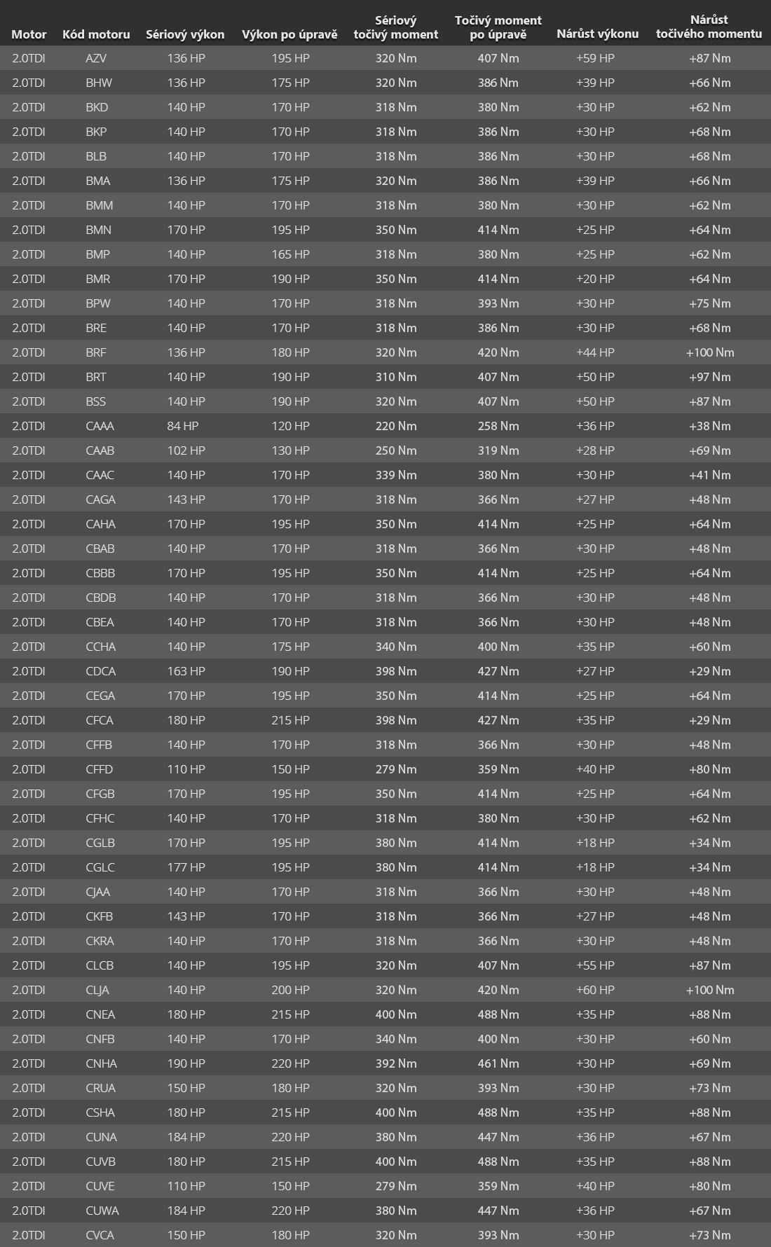 APR má naladění pro širokou škálu motorů TDI (viz seznam), které jsou montovány do různých vozů. Pokud jste nenalezli motor, který je ve vašem vozu, tak nám napište a třeba budeme mít řešení i pro Vás.