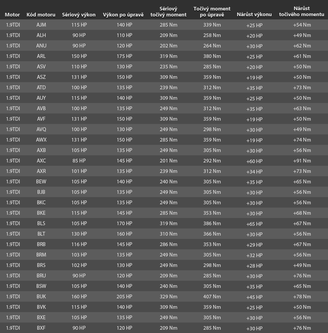 APR představuje tuningový program pro motor 1,9 TDI, který se nachází v mnoha modelech jako například v AUDI A3, VW Golf, Tuguan, Touran, SEAT Leon, Altea, Škoda Octavia, Superb, Yeti, Karoq, Kodiaq a dalších.