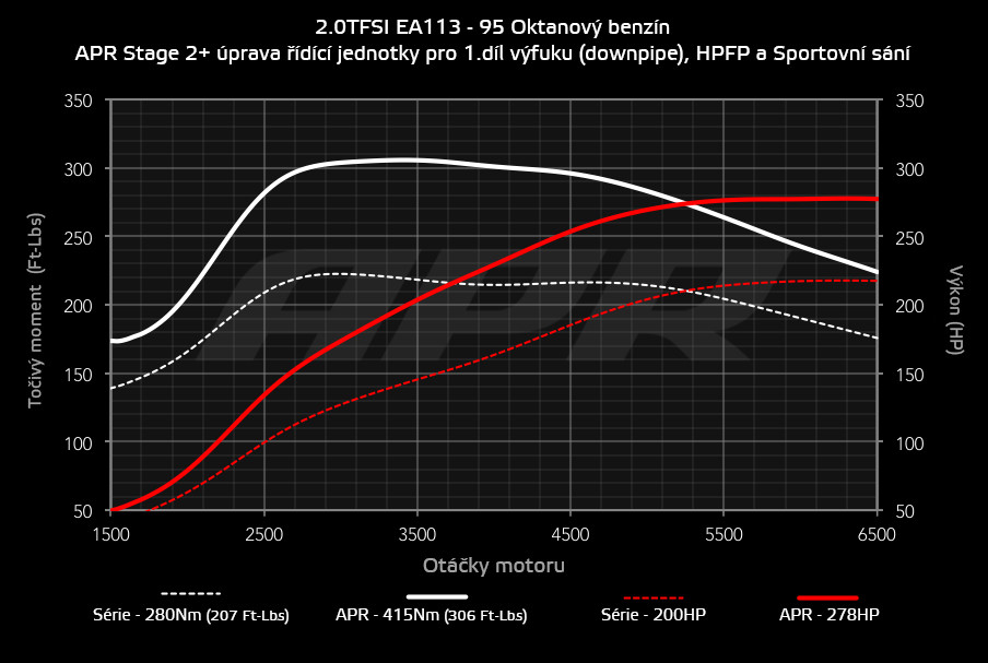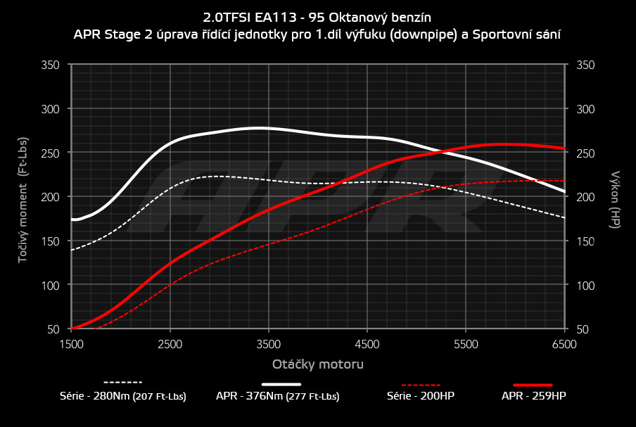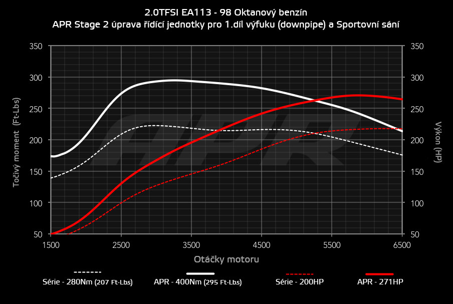 APR Stage 2 pokročilejší úprava řídící jednotky je kalibrovaná pro maximální využití potenciálu přidaných komponent jako jsou Sportovní sání a první díl výfuku / Downpipe. S těmito díly, které odstraňují originální restrikce, lze získat až 259-271hp a 375-400Nm.