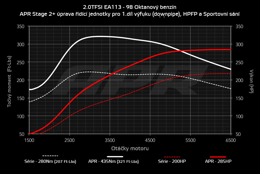 APR Stage 2+ je úprava, která dokáže získat maximum z originálního K03 turbodmychadla. K tomu je potřeba mít namontováno Sportovní sání, První díl výfuku / Downpipe, Intercooler kit a Vysokotlakou palivovou pumpu HPFP, a lze pak získat až 278-285hp a 414-435Nm.