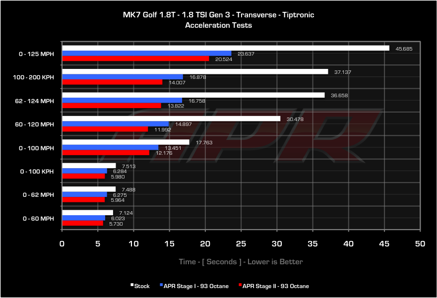 Výsledky jsou ohromující. Jednoduchým přehráním řídící jednotky úpravou APR stage 1, překonal takto upravený VW Golf 7 1,8 TSI (americká verze) svůj seriový protějšek s ohromnou rezervou a nejen to. S lehkostí překonal i VW Golf 7 GTI s DSG převodovkou. Čas z 0-96 km/h se zlepšil o 1,101s, zatím co ze 100-200 km/h se čas zlepšil na 16,758s o ohromných 19,9s dříve! Test zrychlení z 0-200km/h pak prokázal naprosto zdrcující rozdíl, kdy auto s úpravou APR Stage 1 to zvládlo za 23,637s, zatímco auto v seriovém provedení na to potřebovalo 45,685s.