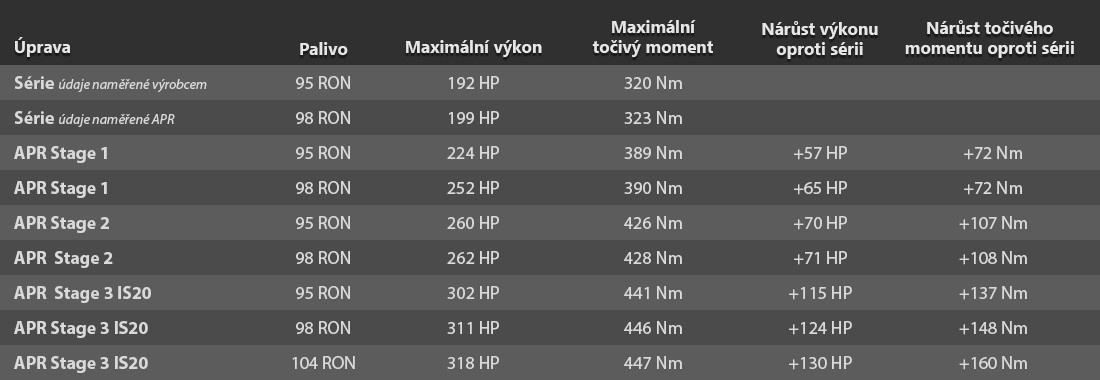 APR Stage 3 je další krok k získání vyššího výkonu. Přidáním originálního většího turbodmychadla IS20, lepšího prvního dílu výfuku, lepšího sání a lepšího intercooler kitu lze docílit ve spojení s APR Stage 3 úpravou řídící jednotky výkonu 302-318hp a 440-447Nm. Výkon zde tak lineárně graduje až do nejvyšších otáček.
